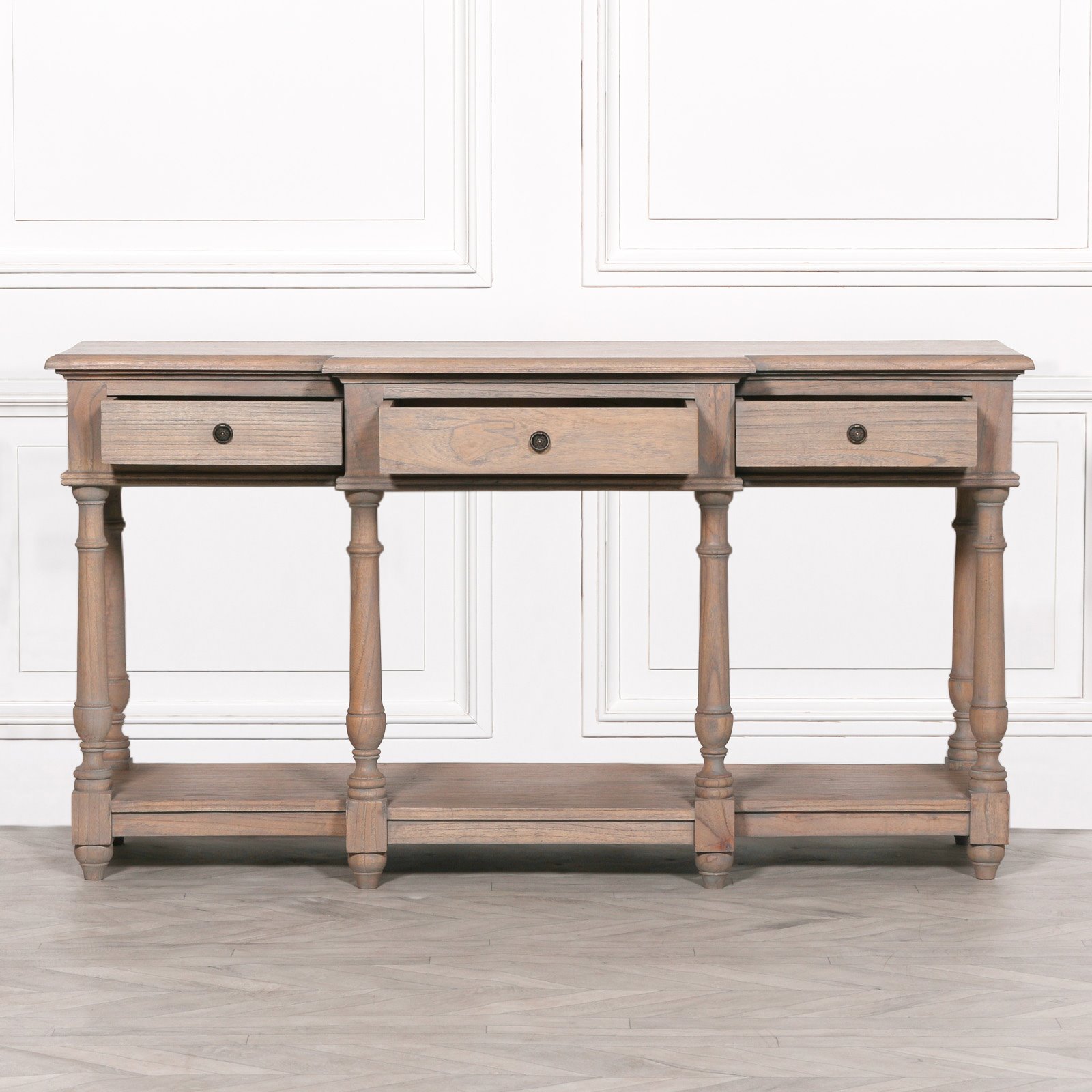 This Cedar wood console table is made from solid wood and finished in an aged slightly grey distressed rustic look, the wood will age over time. There are 3 drawers with metal drop handles and turned legs with a full bottom shelf. The top of the table is shaped for a little extra style with a bevelled edge and the slight washed finish enhances the warmth and grain of the wood, absolutely beautiful.