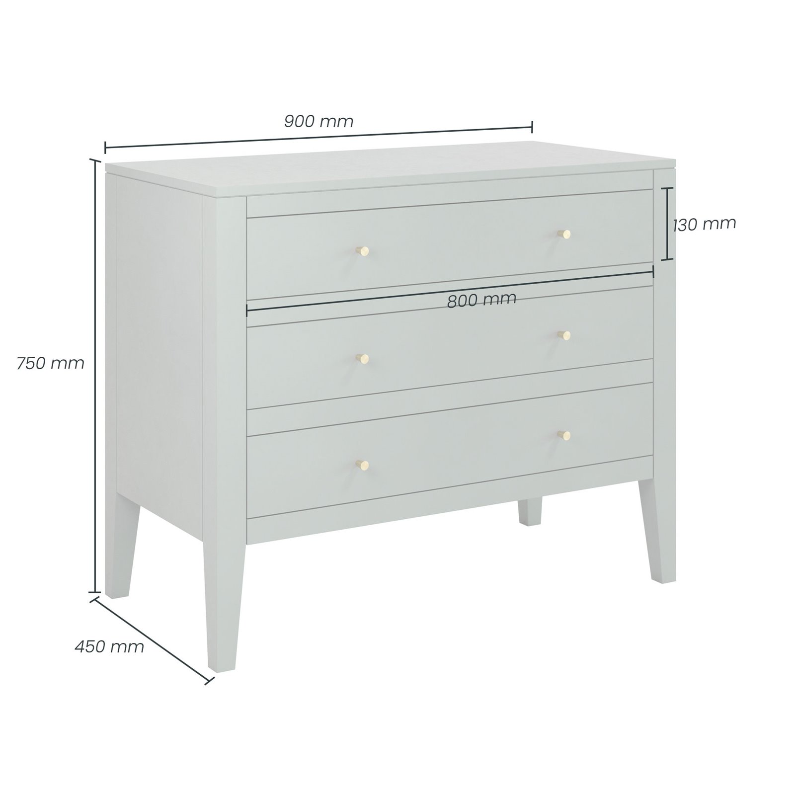 This lovely classic chest of drawers is finished with a pigeon grey paint  on solid birch wood with mdf internals. The chest has tapered legs and three deep drawers set on wooden runners finished with small brass style handles.  A beautifully simple and classic style of chest of drawers that will fit easily into a traditional or contemporary setting.