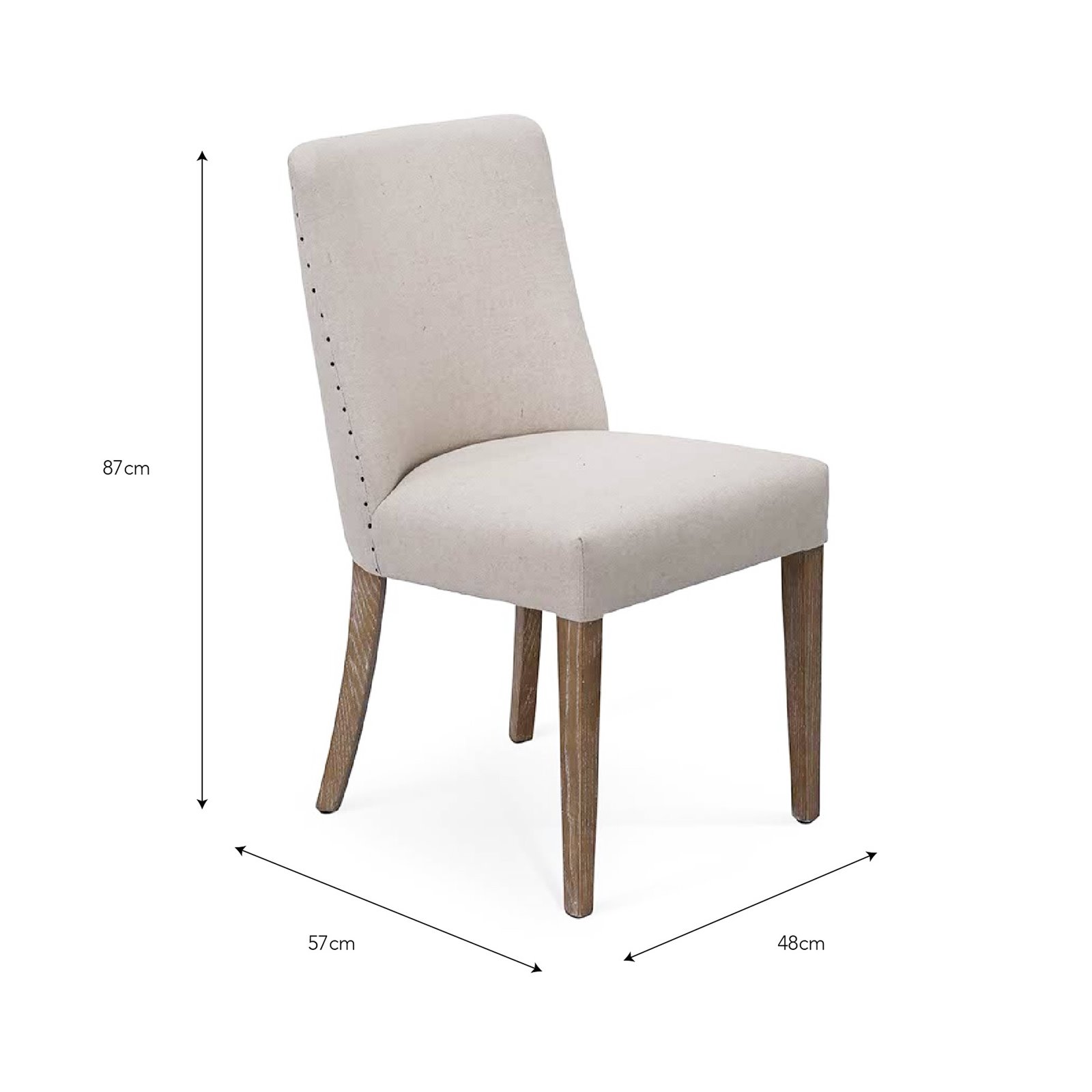 Our lovely new Alice Chair is a real classic that's good for pairing with both traditional and modern interior design schemes. Complete with stylish studs down the side, its lovely natural 100% linen fabric makes it hard-wearing as well as incredibly comfortable for long lunches, family gatherings and dinner parties. Its legs are made from solid dark ash wood with a wash, toning well with any existing colour palette.   A simple design that could be used in both classic and contemporary interiors.