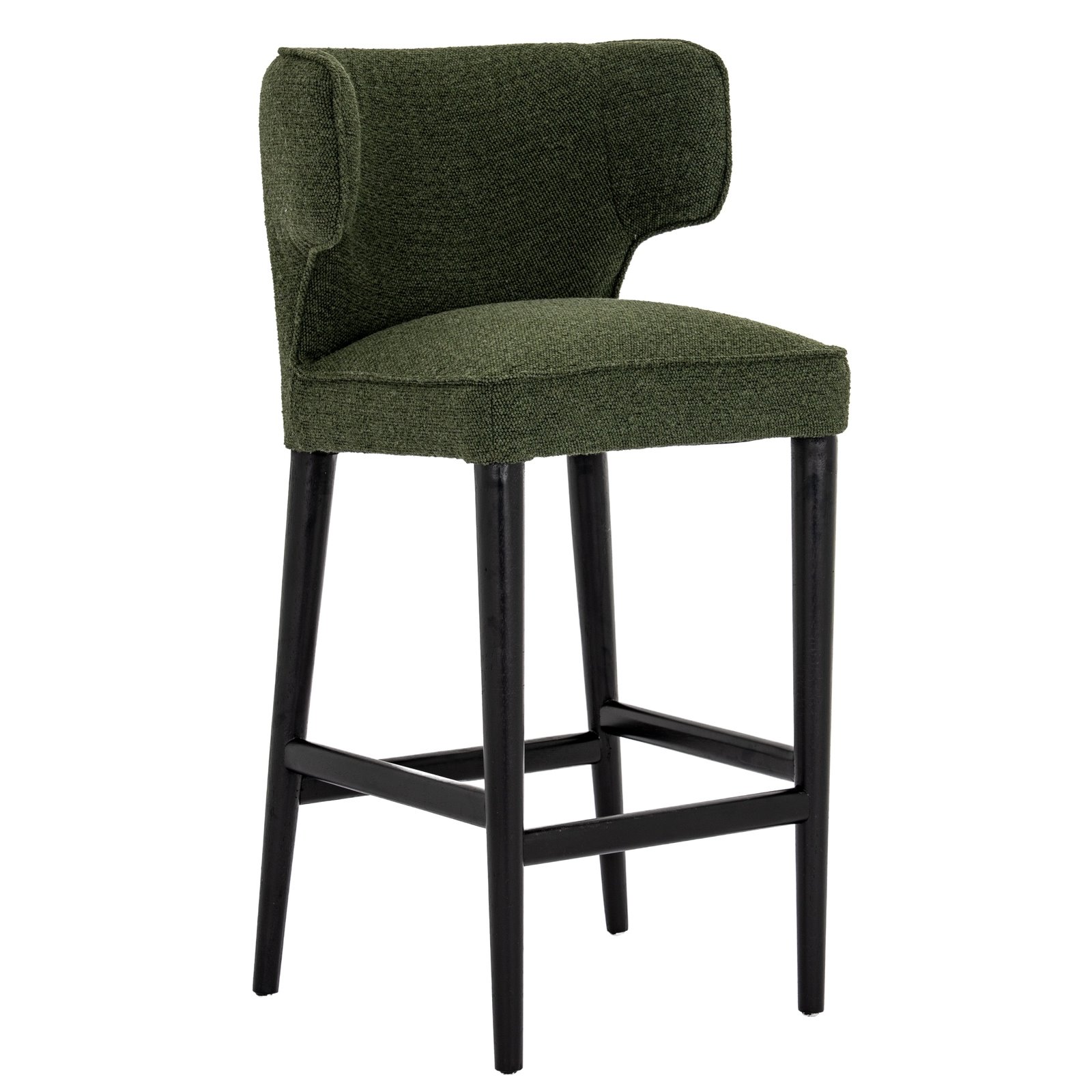 These gorgeous stools are so comfortable and inviting. The fully padded seat and back wrap around you as you sink into the deep chair and rest your feet on the handy foot bar. The stool is upholstered beautifully in a slightly raised fabric with deep moss green tones with raised stitching and piped edges. The legs are solid wood and stained in ebony to compliment the moss green fabric tones perfectly.