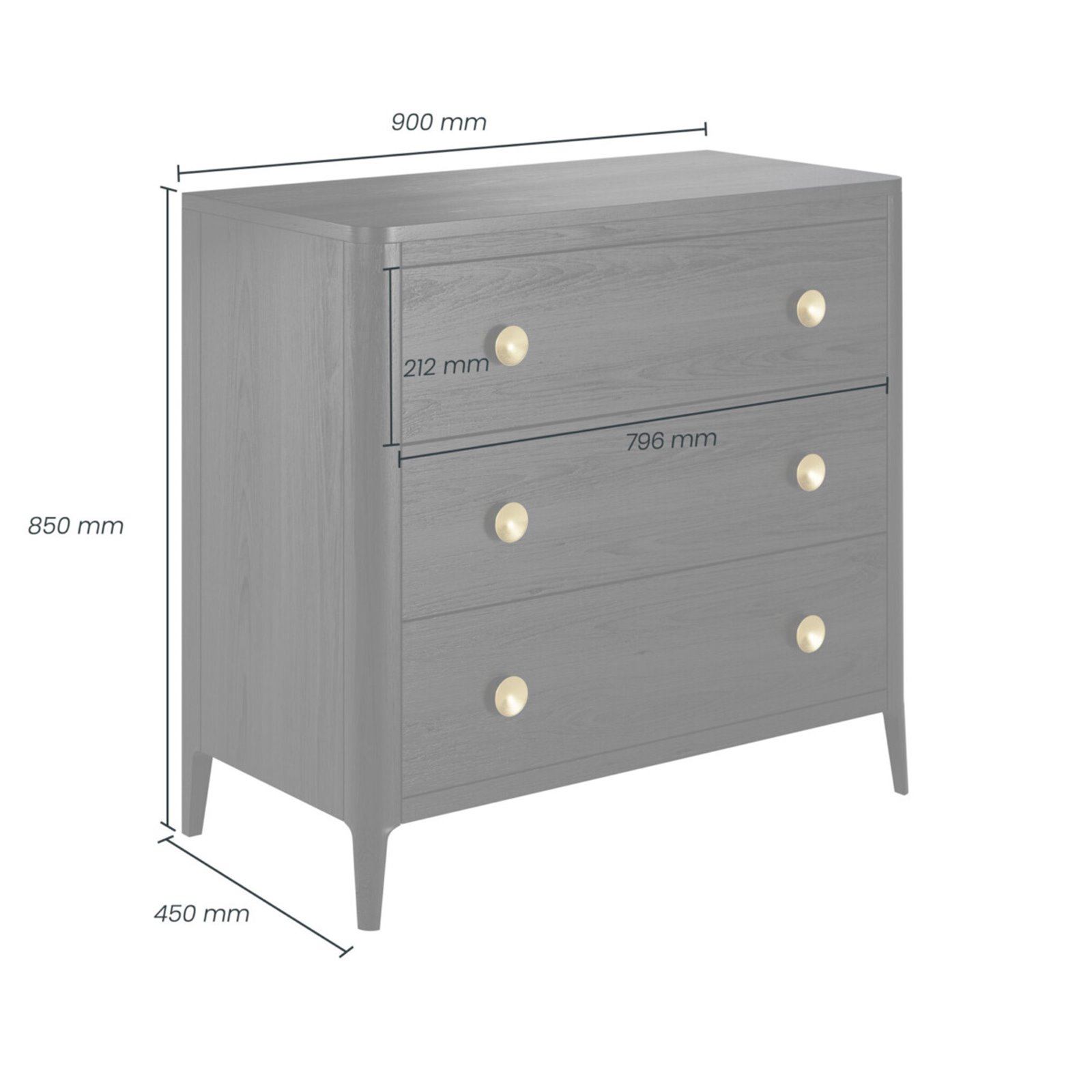 This lovely classic chest of drawers is finished with Black stain over solid Oak with Oak veneer internals, it has a smooth sheen varnished finish which shows the grain of the wood. The chest is made from solid Oak with three deep drawers on metal runners with two large brass coloured round handles. The chest is finished with tapered splayed legs that compliment the simple classic style of the chest perfectly.