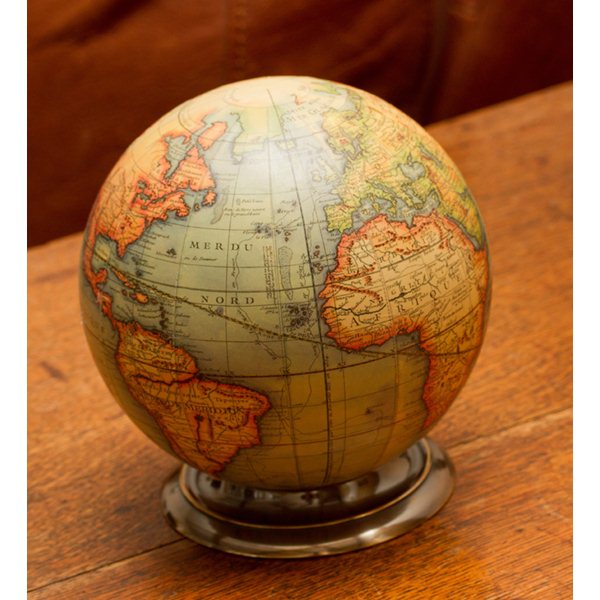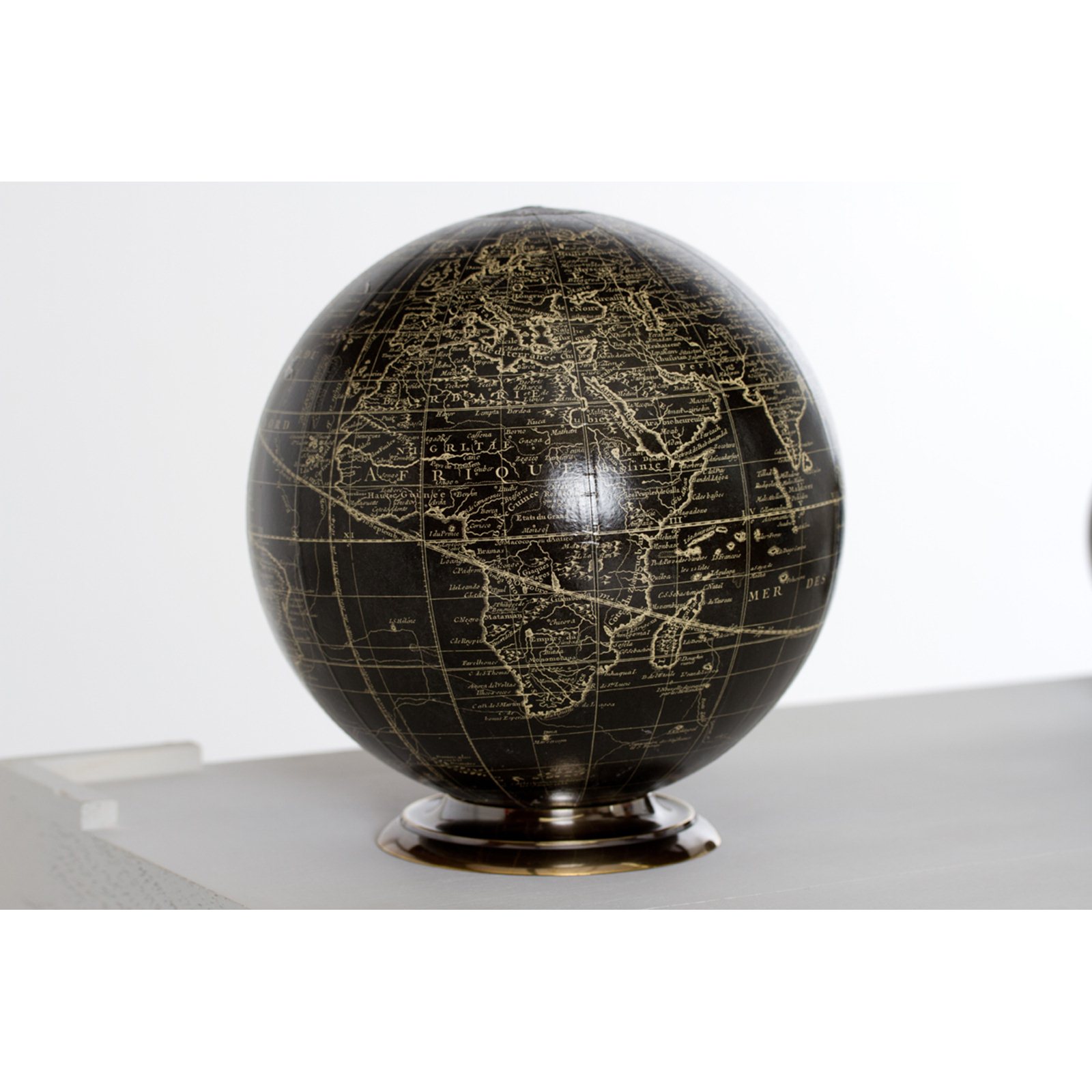 These French inspired globes combine decoration mixed with history and exploration. 18th.C. cartography in the fashionable 21st. C colours. Ivory and Black. Display on steel bases and enjoy and mix of sizes and colours. Explore the routes followed by early explorers. Stimulating, extraordinary, poetic.