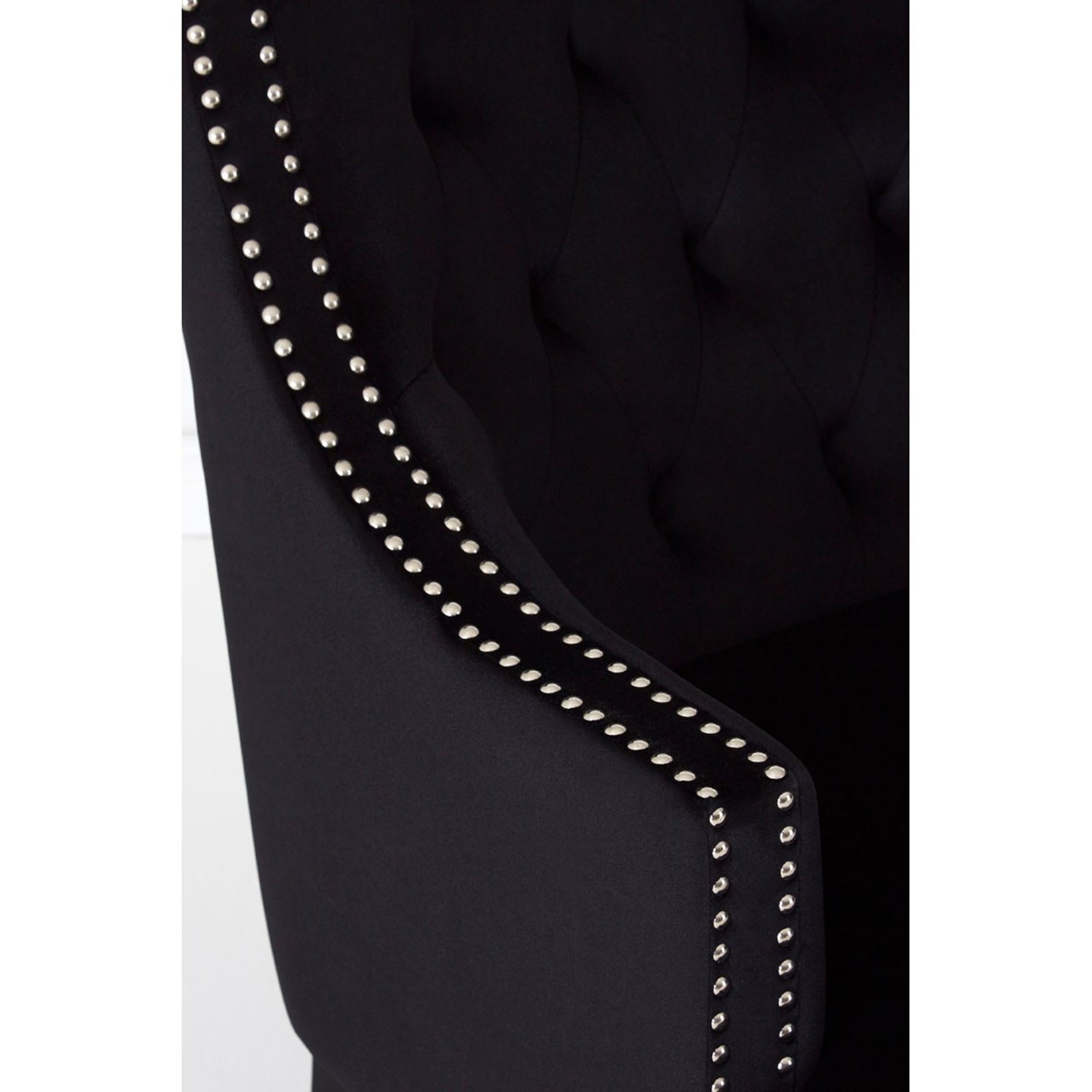 This chair makes a sophisticated impression thanks to its luxurious black velvet upholstery. Its high, curving back references traditional approaches to design, amplified by the deep button tufting that forms a comforting quilt pattern. The silver coloured studs trace the curve of the arms, adding a reflective touch to this lovely chair. Also available in Grey and Blue.