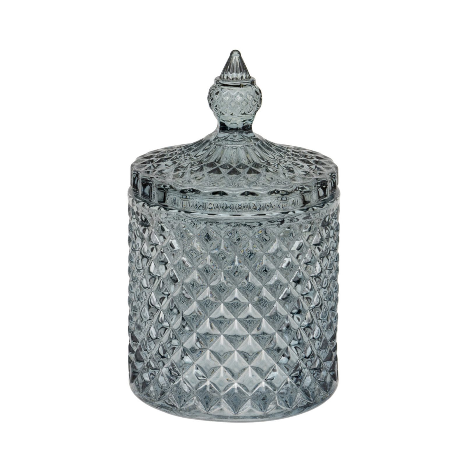 This gorgeous glass jar is perfect for storage in your bathroom or bedroom. The thick glass has a deep cut diamond pattern that reflects the light and adds a little glamour to your room where ever you choose to place it. The top has a gentle curve to the plain finial top. Fill with cotton buds or pop on a bedside table and fill with your favourite sweet treat for a guest!