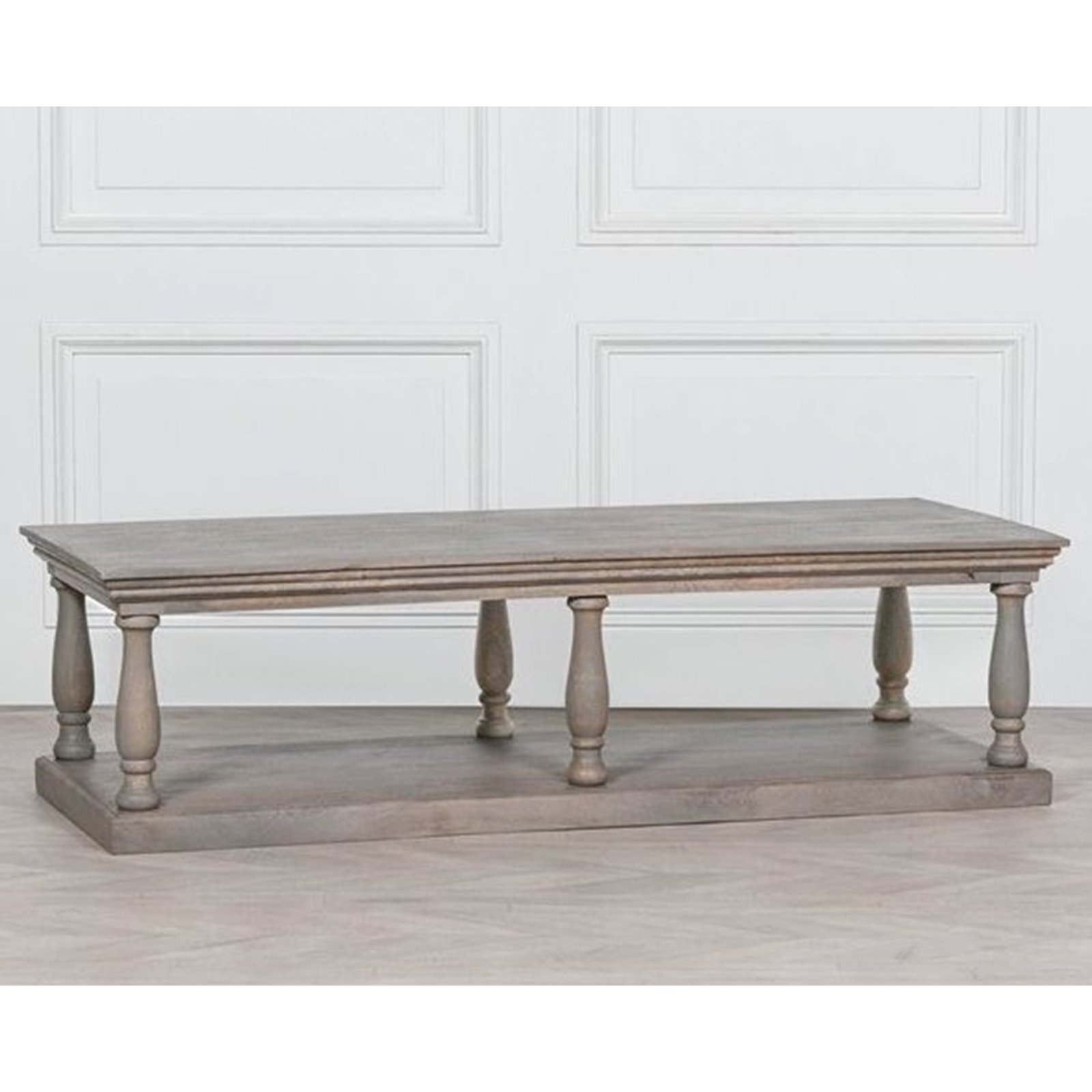 The rustic wood Colonial coffee table features a washed finish that enhances the attractive and prominent grain patterns. The texturally-rich table has a plinth base with six pillar-style legs that are turned and elegant. The traditional carved detailing recalls colonial design and adds subtle decoration to the otherwise classic table.