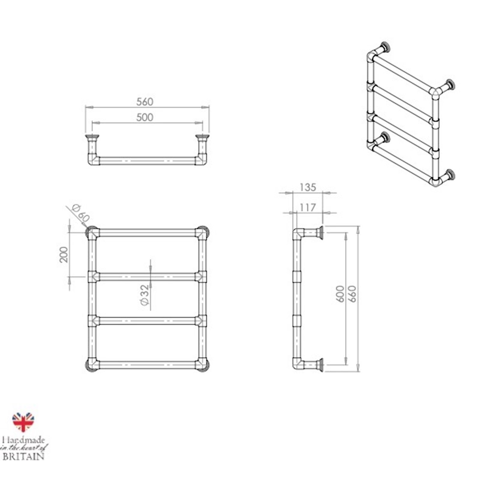 This towel rail is hand made in Britain in solid brass and plated in Chrome. The towel warmer measures 560mm x 660mm overall with a projection of 135mm and is constructed in the standard 32mm tube.
