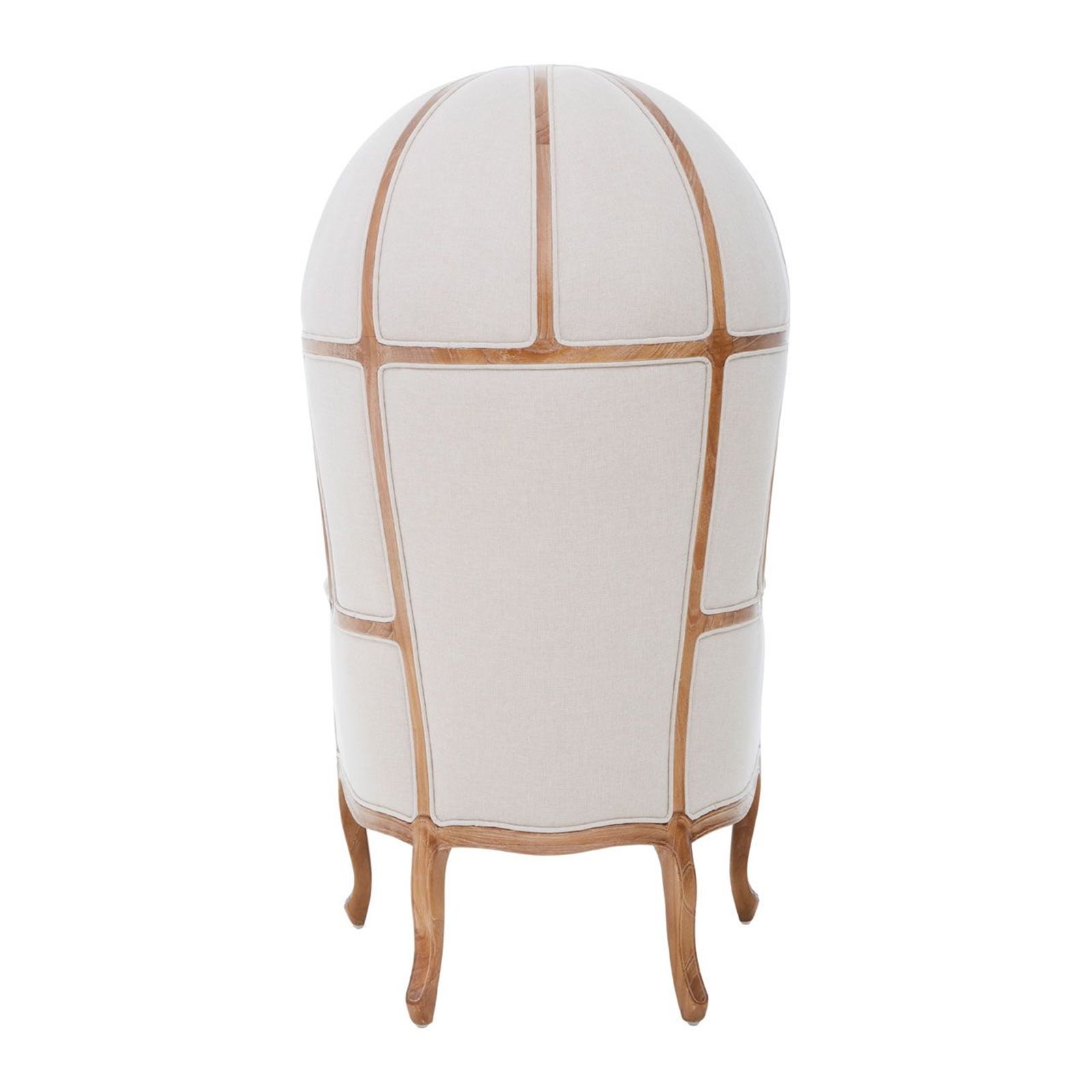 This impressive porters chair is covered in a thick linen mix cream fabric and is fully padded . The chair is made in solid wood with a washed oak finish, carved detail at the bottom of the seat and elegantly curved legs. The wooden frame showing between the fabric panels gives a contemporary feel to this classic chair. Perfect for an important entrance hall or gentleman's study. Also available in Grey.