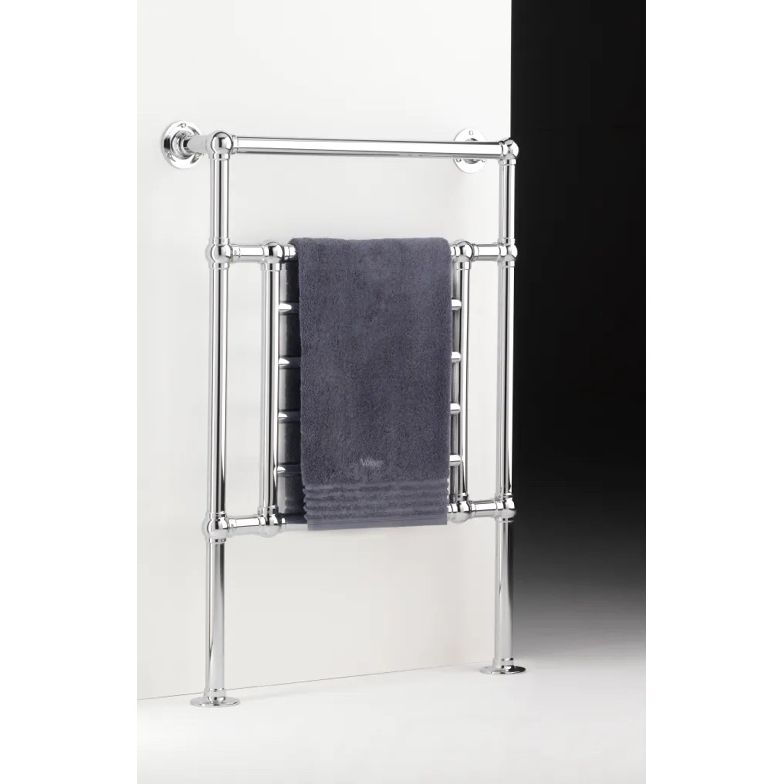 This floor standing towel rail is hand made in Britain from solid brass and then plated in Chrome or a colour of your choice. Perfectly configured these towel rails will fit seemlessly into your bathroom, there are no exposed wires or valves on show. Working from a switch placed where you decide the towel warmers will use roughly the same amount of electricity as a lightbulb so are not only efficient but eco friendly too.