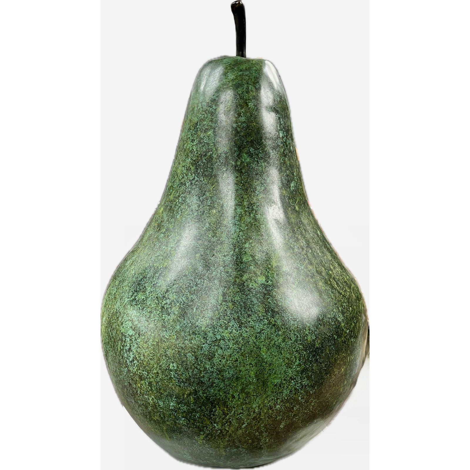 This pear is nearly a meter tall and each one is unique. The finish is a mottled two-tone cast bronze. This pear is varnished so it is also suitable for outdoors but will age and patina over time.  It will make a statement where ever you choose to place it.