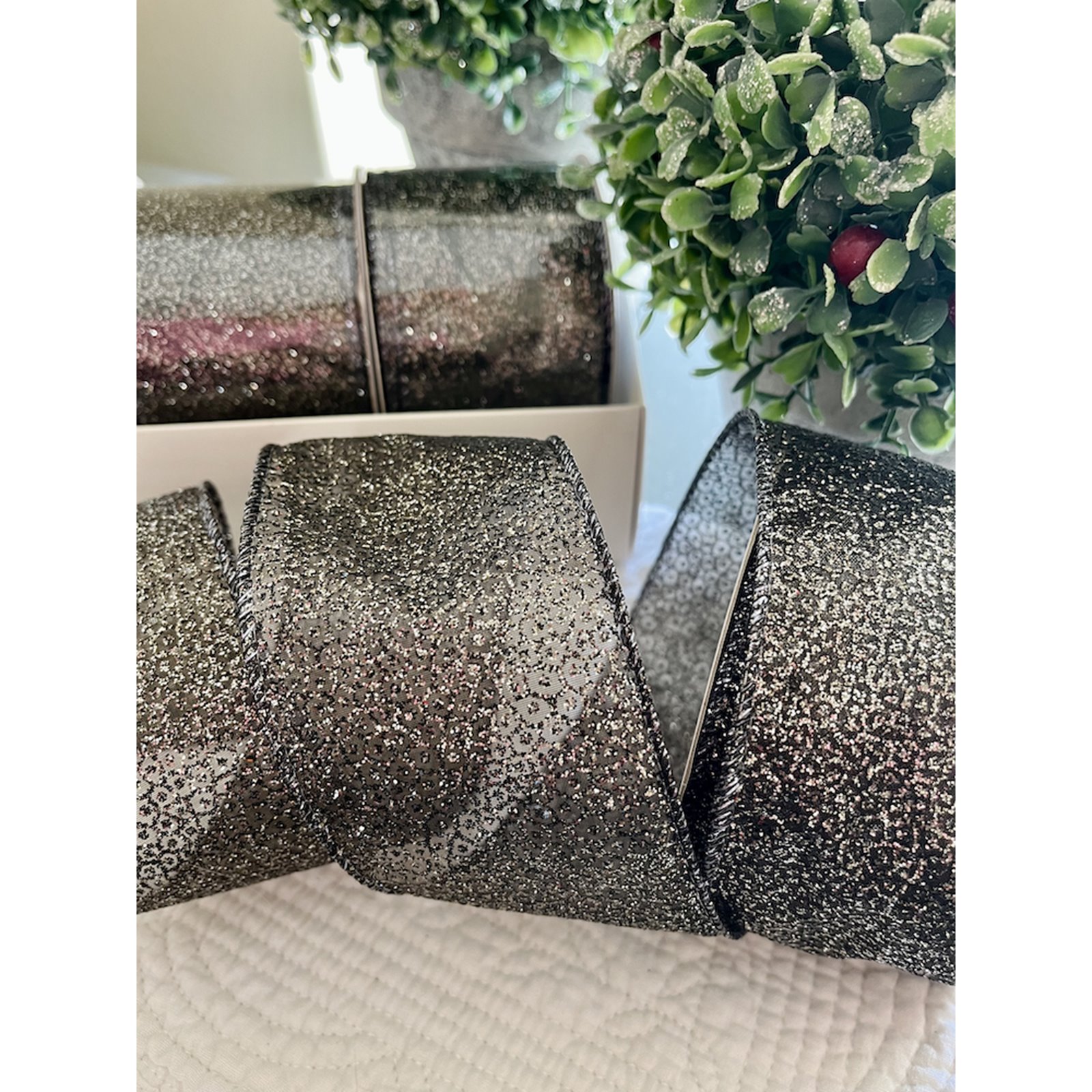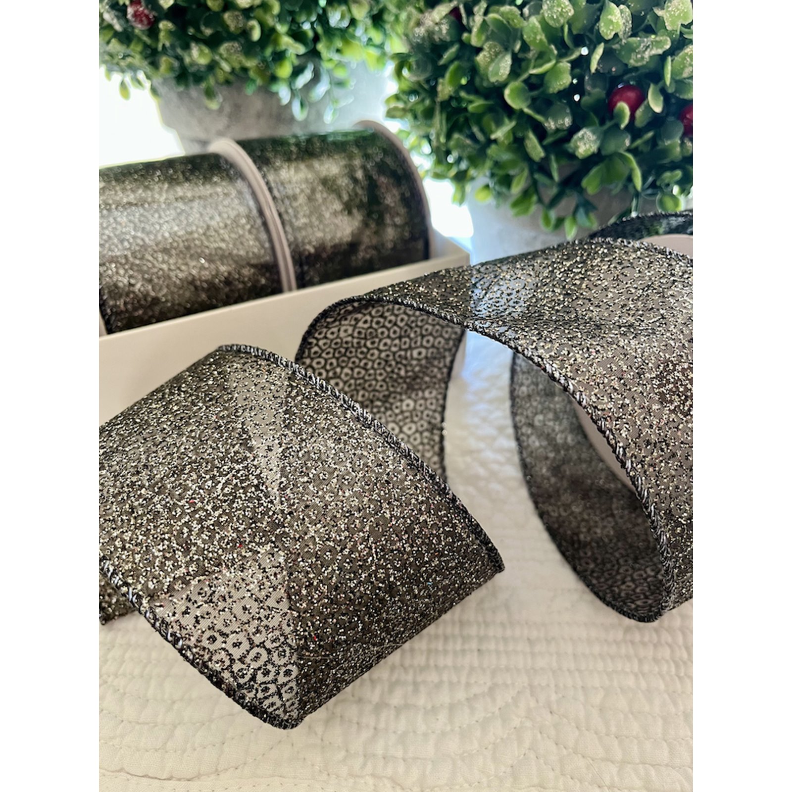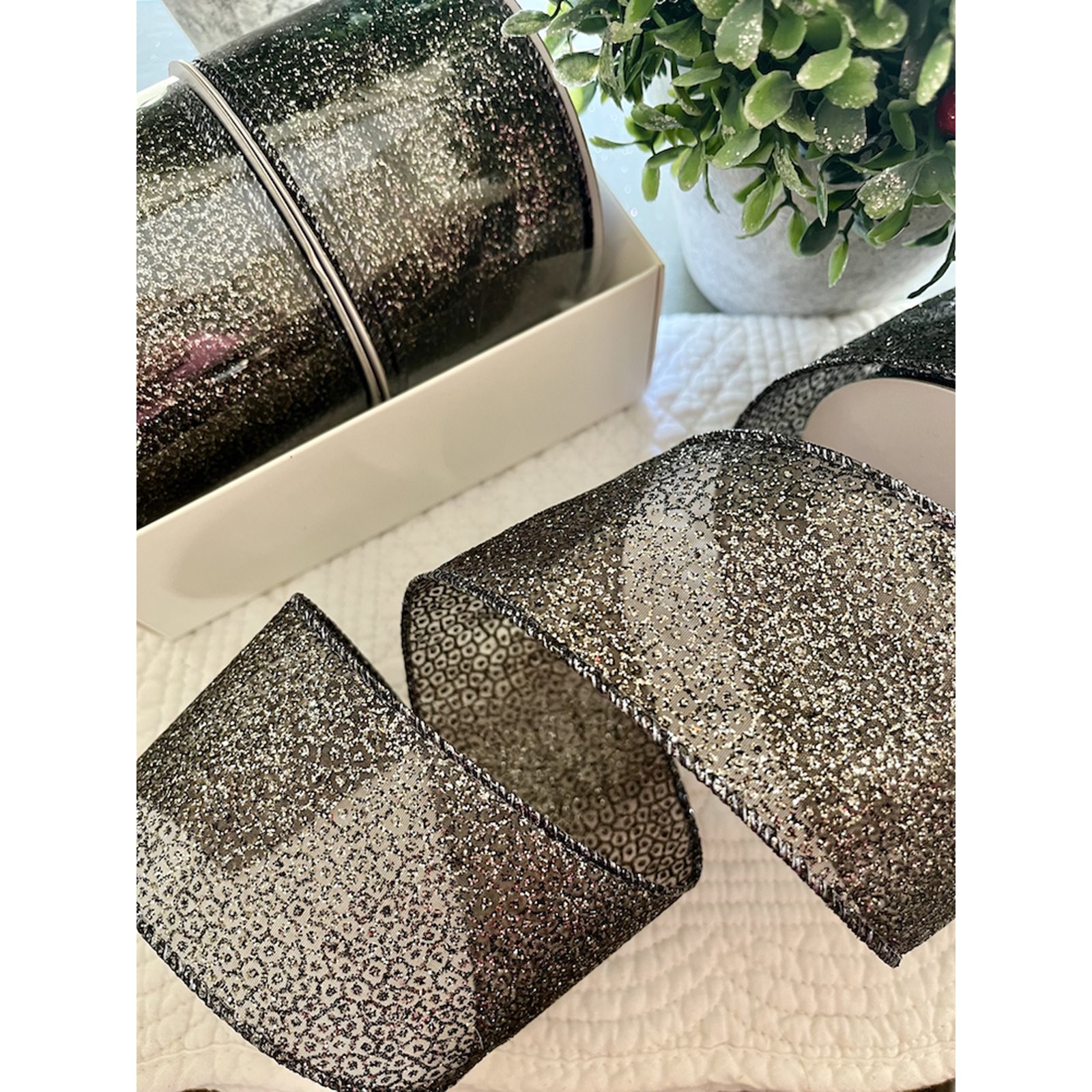 This gorgeous glittering ribbon has almost a soft leopard print pattern within the black sparkling glitter design. The ribbon is light with a woven edge that has a small wire to enable you to form into bows and ruffles easily , wrap the most contemporary of presents beautifully and even drape over your Christmas Tree.