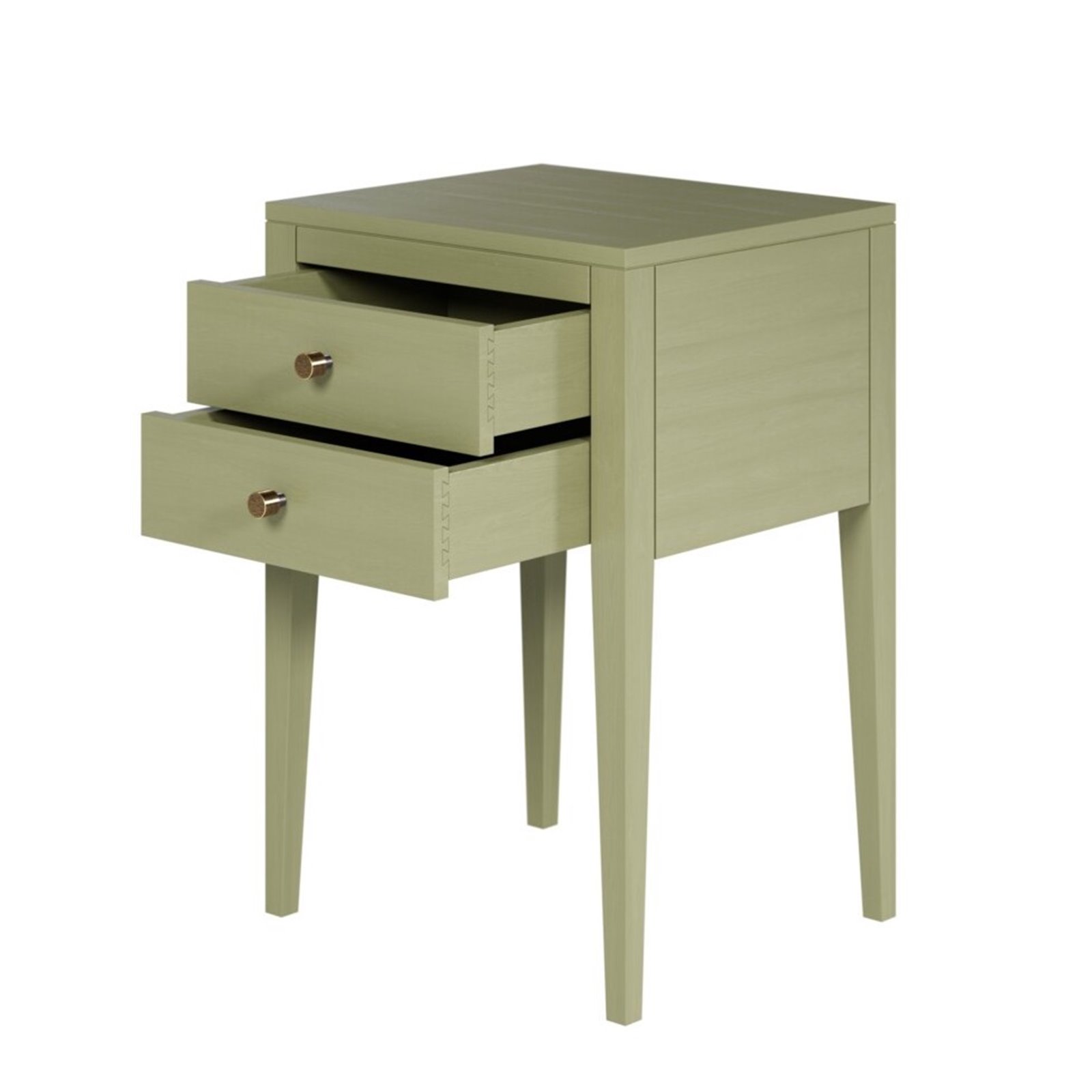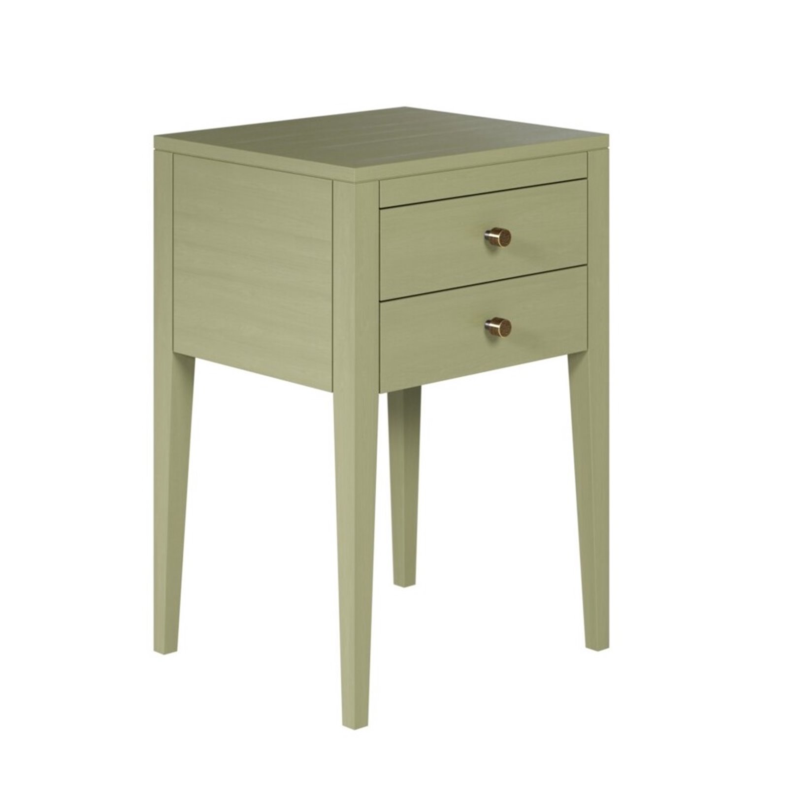 This lovely soft litchen green bedside is made in solid Oak with Oak veneer and a soft sheen finish. The drawers are set on metal runners and the tapered legs have the same paint finish with visible grain of the Oak showing slightly which is a lovely feature of the table. The drawers are finished with a brushed brass small round handle. Solid and sturdy the table is hand finished and fully assembled.