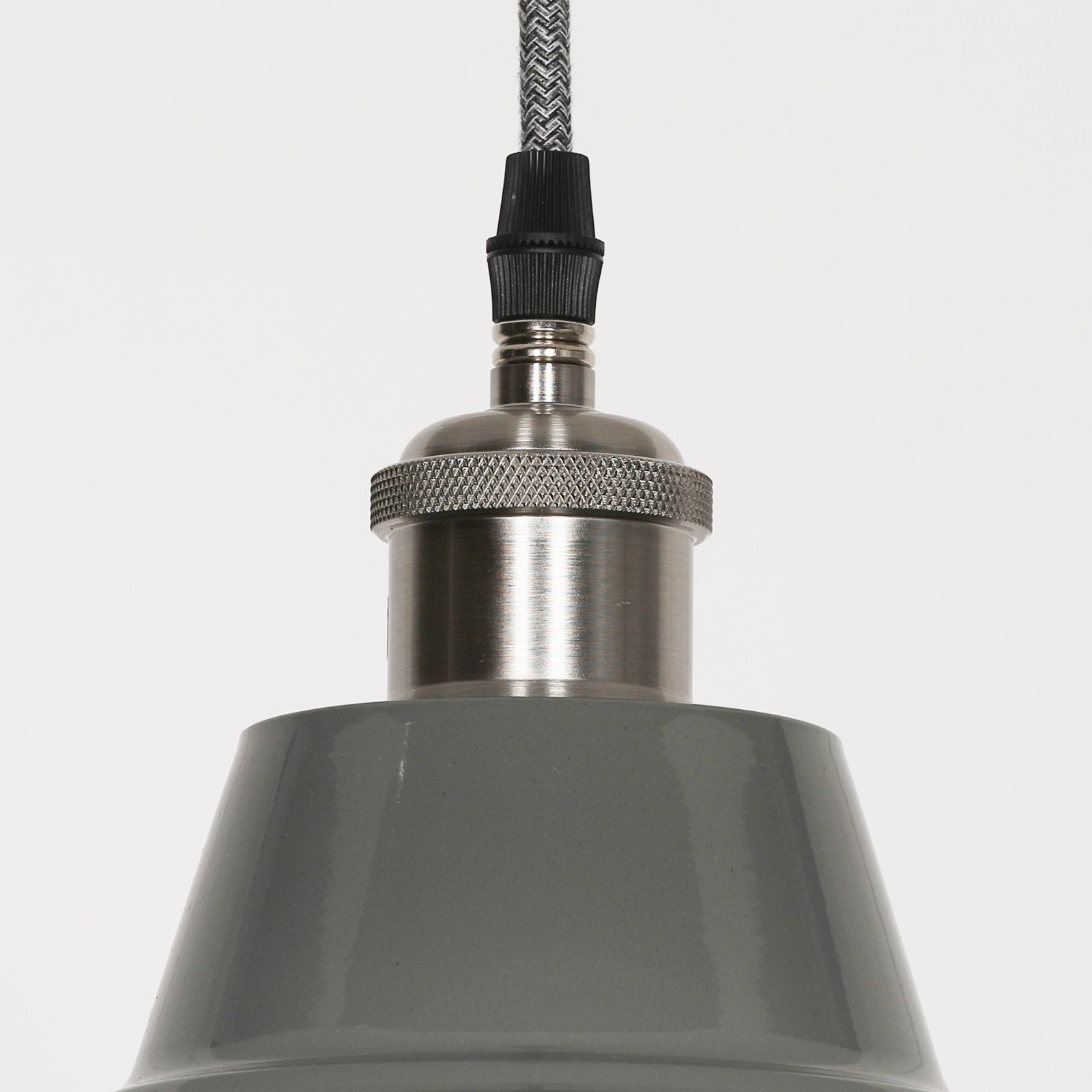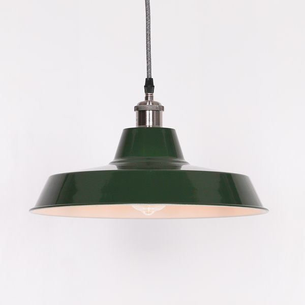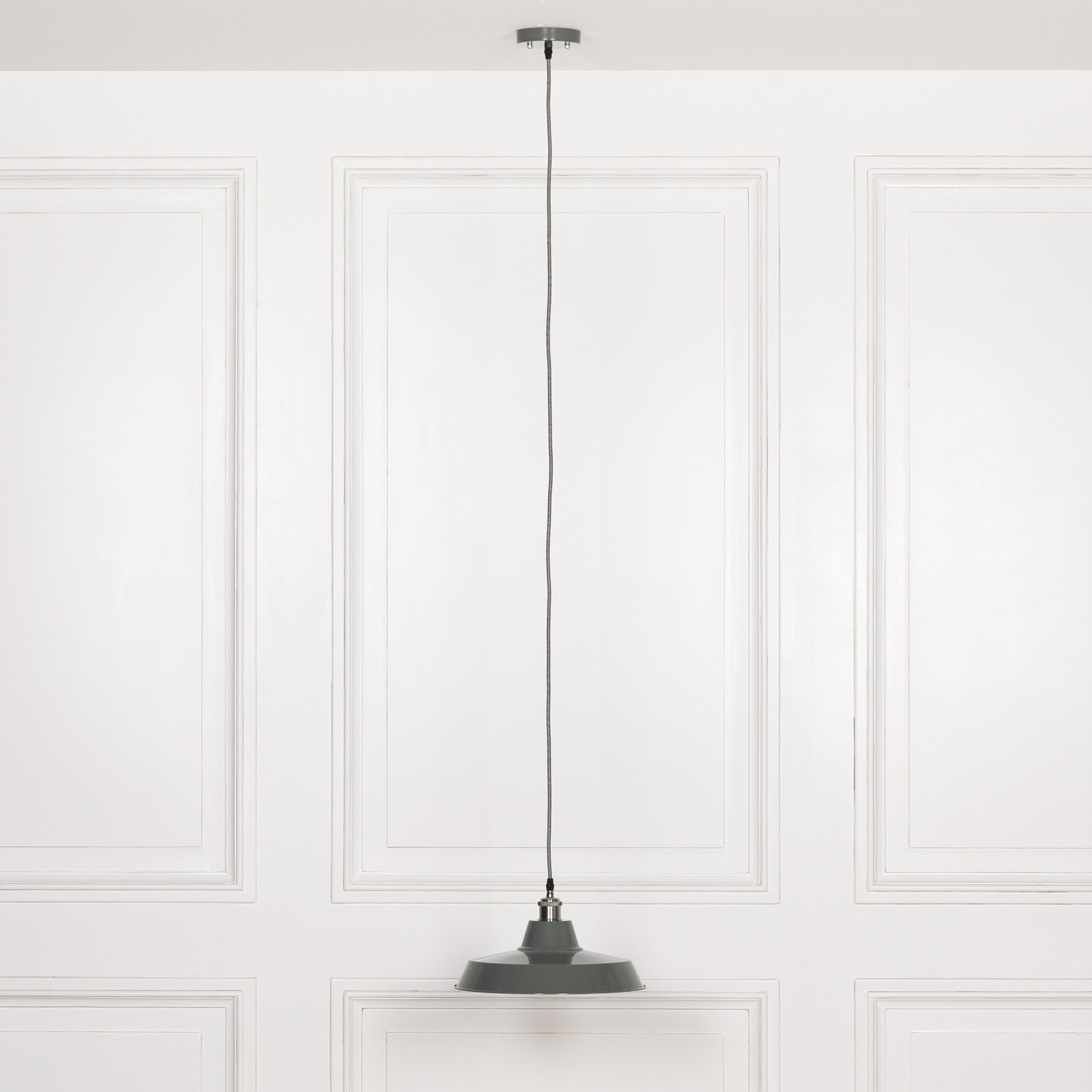 This is our Calstock industrial pendant light which is handmade by time served craftsmen. A nice sized factory style light based on an original design. Manufactured in a variety of colours, with a white gloss interior you can shorten the drop if required.  This one is in rich grey and has a grey black braided cable.