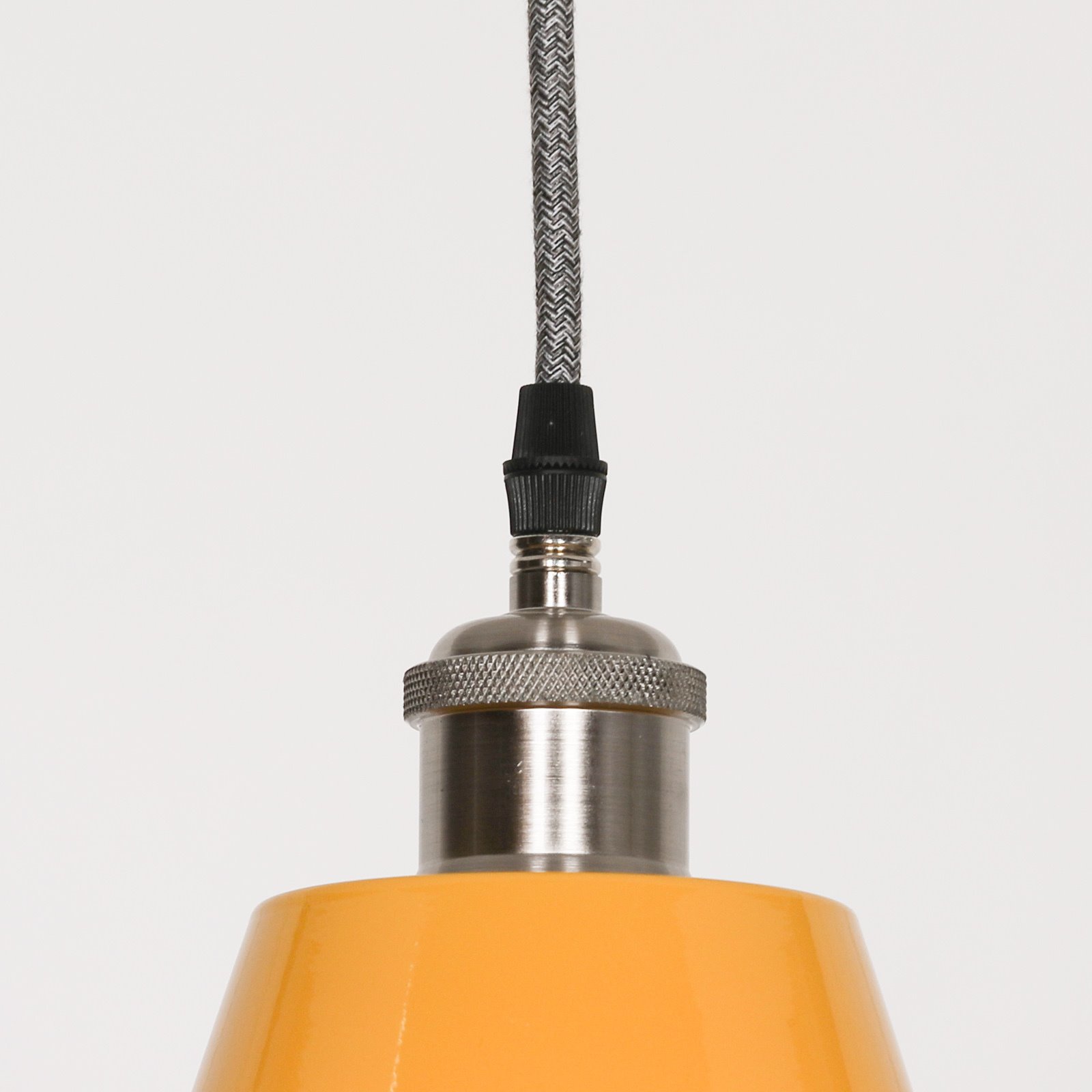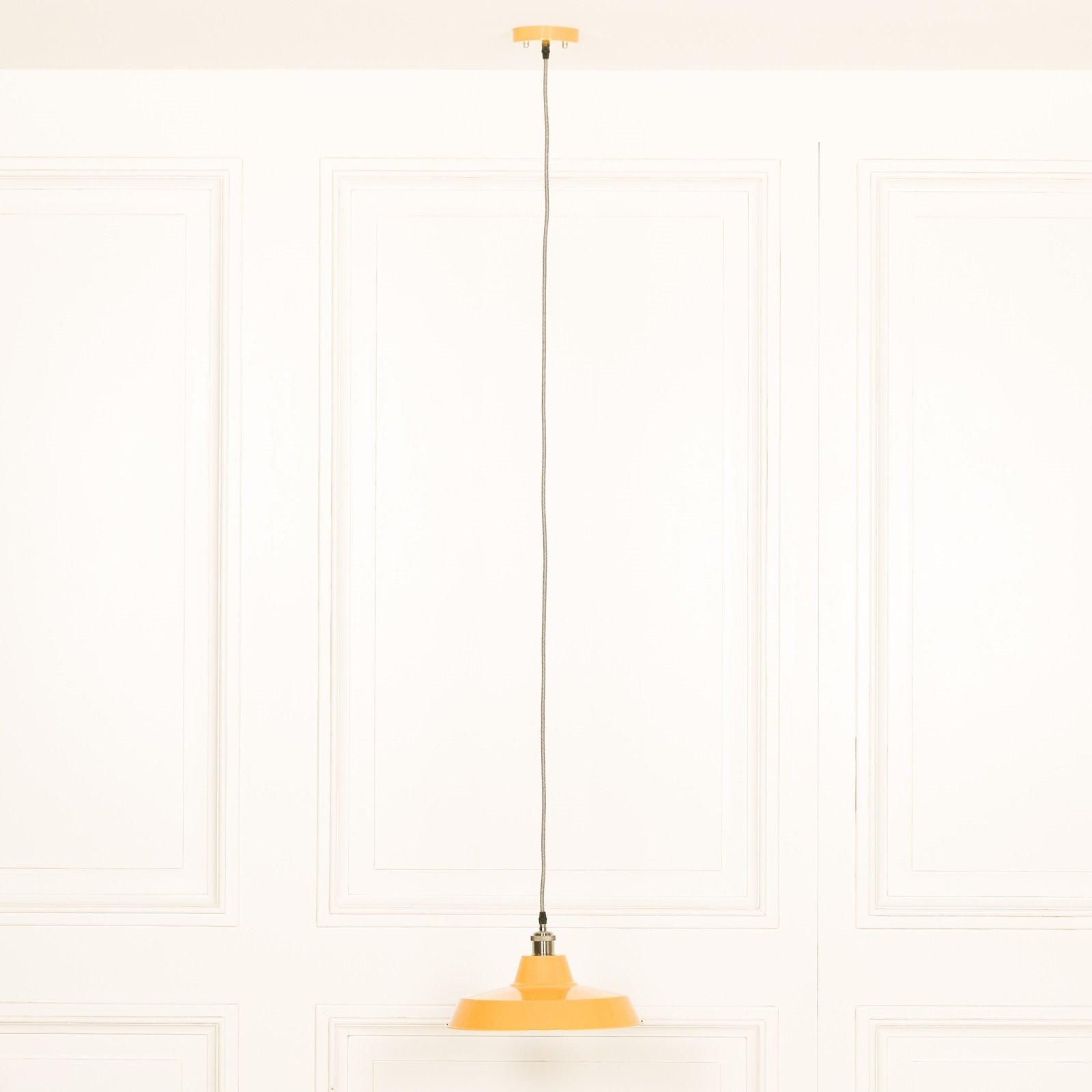 This is our Calstock industrial pendant light which is handmade by time served craftsmen. A nice sized factory style light based on an original design. Manufactured in a variety of colours, with a white gloss interior you can shorten the drop if required.  This one is in rich mustard yellow and has a contrasting grey black braided cable.