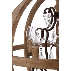 This lovely chandelier resembles a cage, containing five metal arms, each featuring a socket that resembles a melting candle. The chandelier is designed to hold five 25W light bulbs. The wood has an unfinished, weathered look, and the metal chain holding it up has an artificially rusted texture, giving the chandelier a rustic, shabby chic appearance. The droplets reflect the light to add extra ambiance with the bulbs are on.