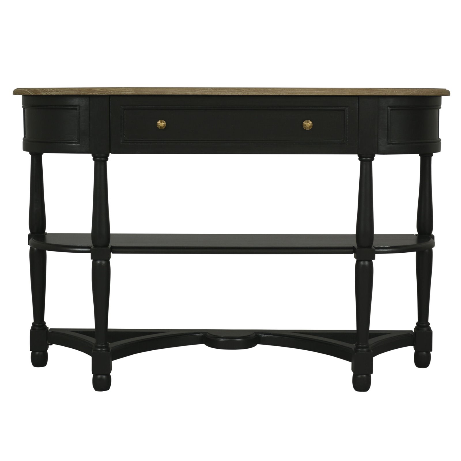 This lovely console will bring style and interest to your home. Made in solid wood the table has a lovely ebony paint finish with the top of the table left in the natural finish to show the lovely warmth and grain of the wood. The table has a deep central drawer with two button handles for a little extra storage. A gorgeous table in a timeless design.