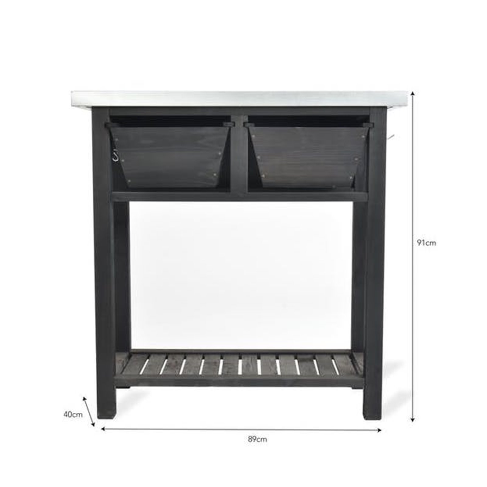 Whether you’re a pro or novice the metal top Potting Bench features a range of inbuilt storage to help with gardening. There are two drawers, one specifically designed to house loose soil, a Galvanised Sheet metal top for potting up plants and hooks each side for hanging tools and accessories. The left side includes four moveable S hooks whilst the right has two fixed hooks.