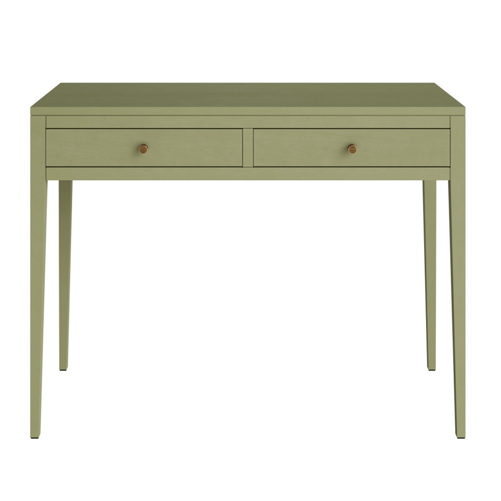 This lovely litchen green console is made from solid oak with oak veneer with a soft paint which does show the grain of the Oak but giving the table a smooth to the touch finish . The table has two  drawers with metal runners with small round metal handles finished in a soft brass.