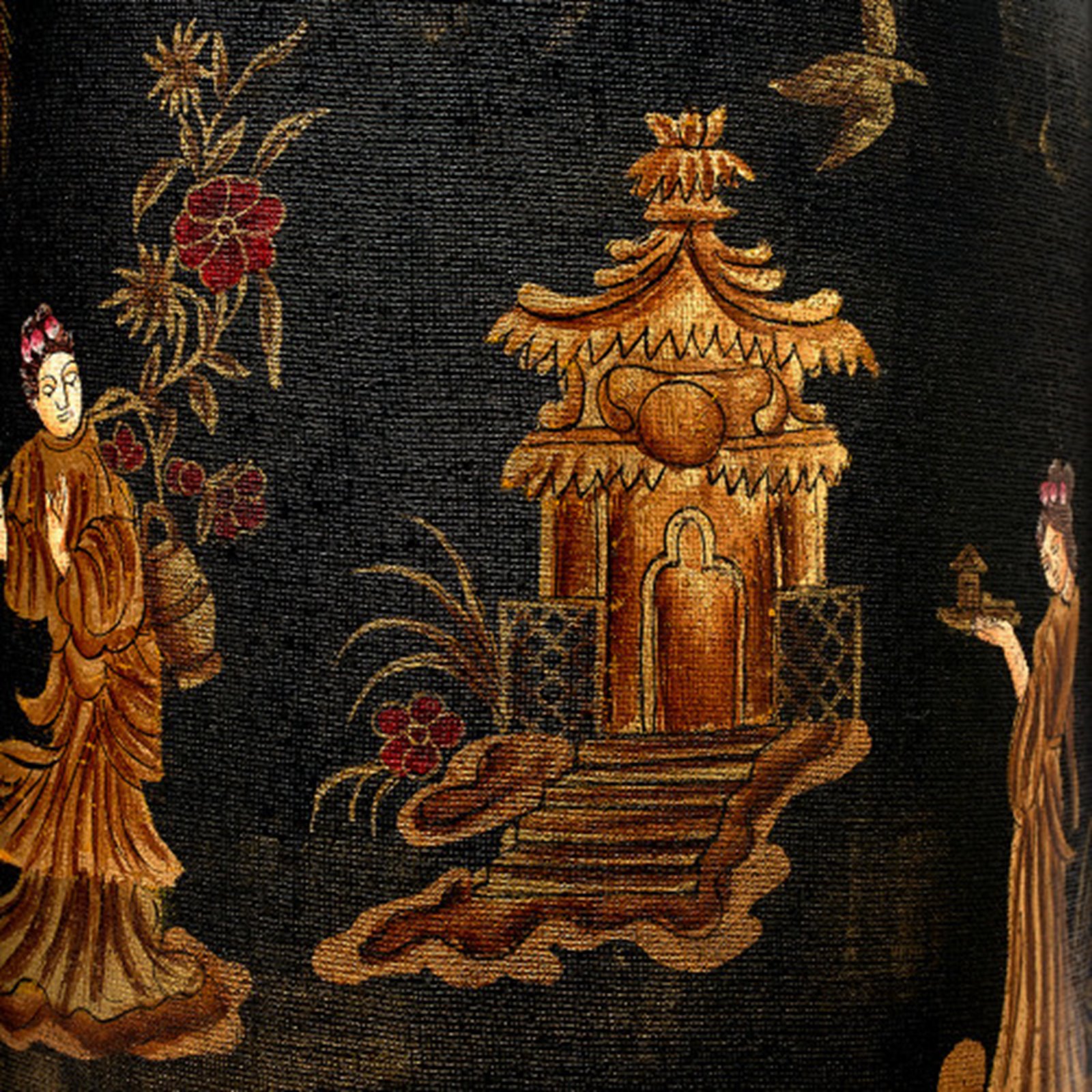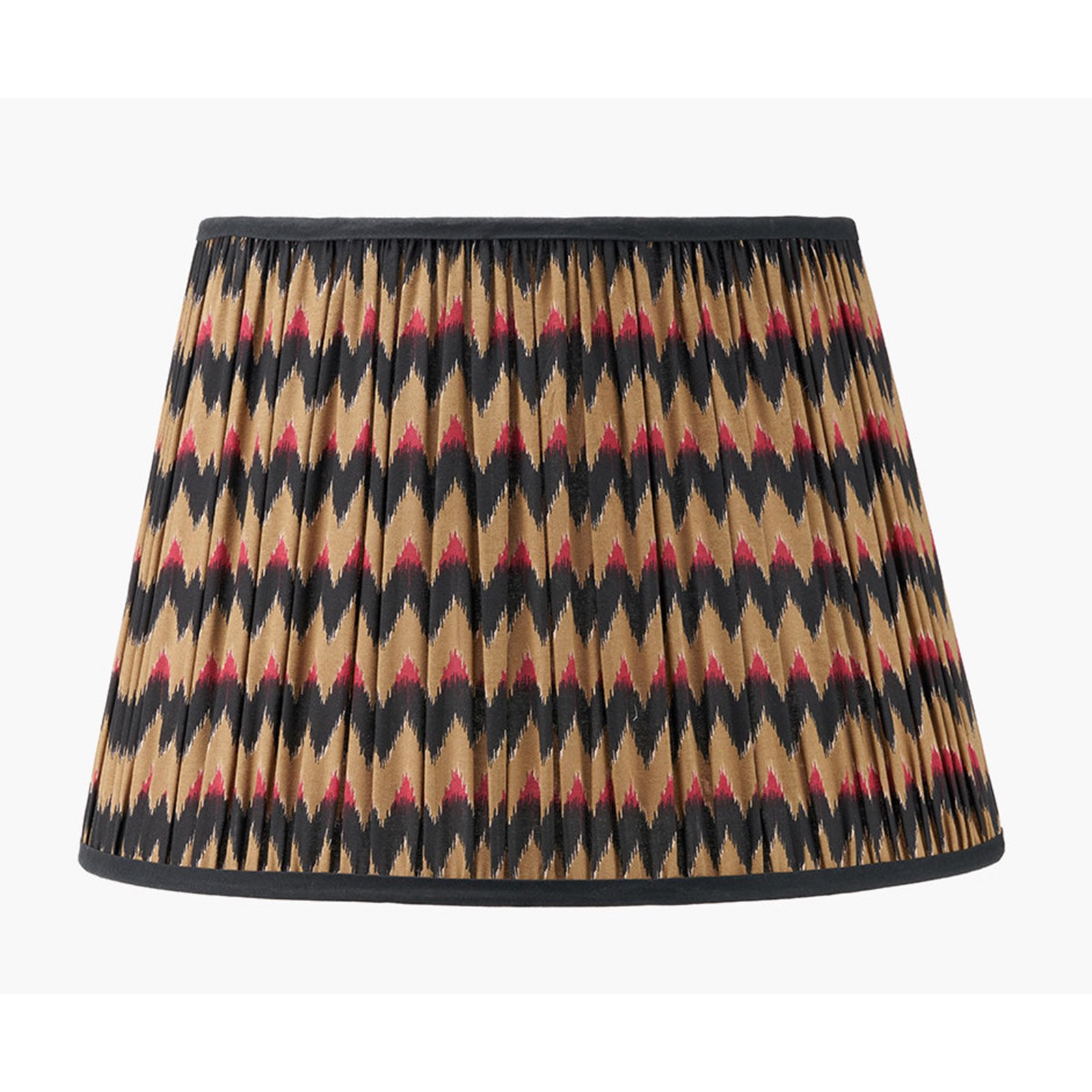 This beautiful hand painted lacquered iron lamp base in antique black with a stunning oriental landscape theme is a true work of art. The design features an incredibly intricate illustration, all of which is painted free-hand in a rich colour palette, creating a fascinating, awe-inspiring piece. The beautiful shade has a multi coloured chevron pattern complimenting the base perfectly.