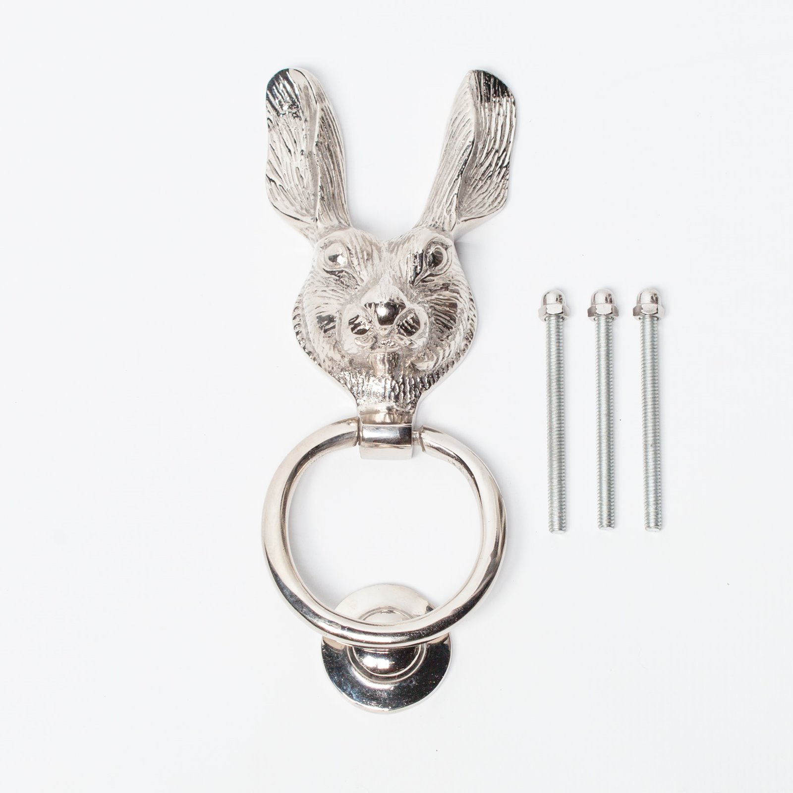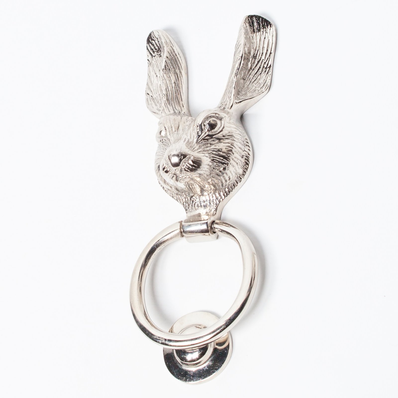 We all love this bunny rabbit door knocker available in bright silver chrome. This door knocker has a lovely detailed furry head with huge standing up ears it is handcrafted from solid brass and plated with chrome. It is in two parts with a large drop ring knocker and button knocker to place under the ring.