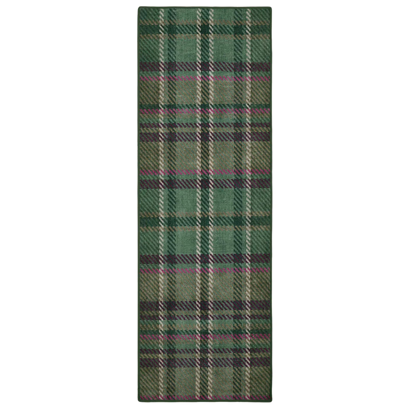 Our Shetland Plaid Emerald washable rug features a green background with green and purpled toned interlocking stripes.