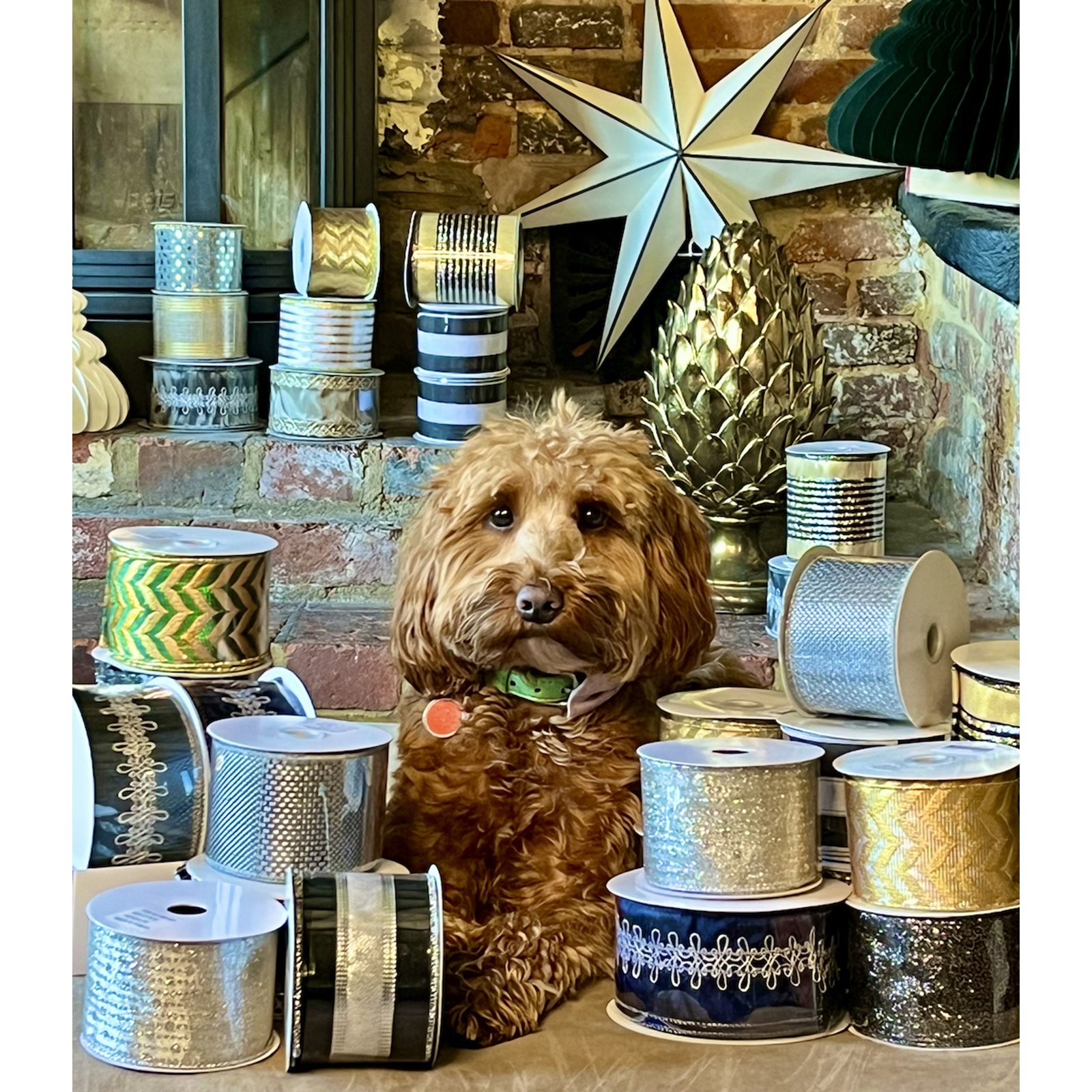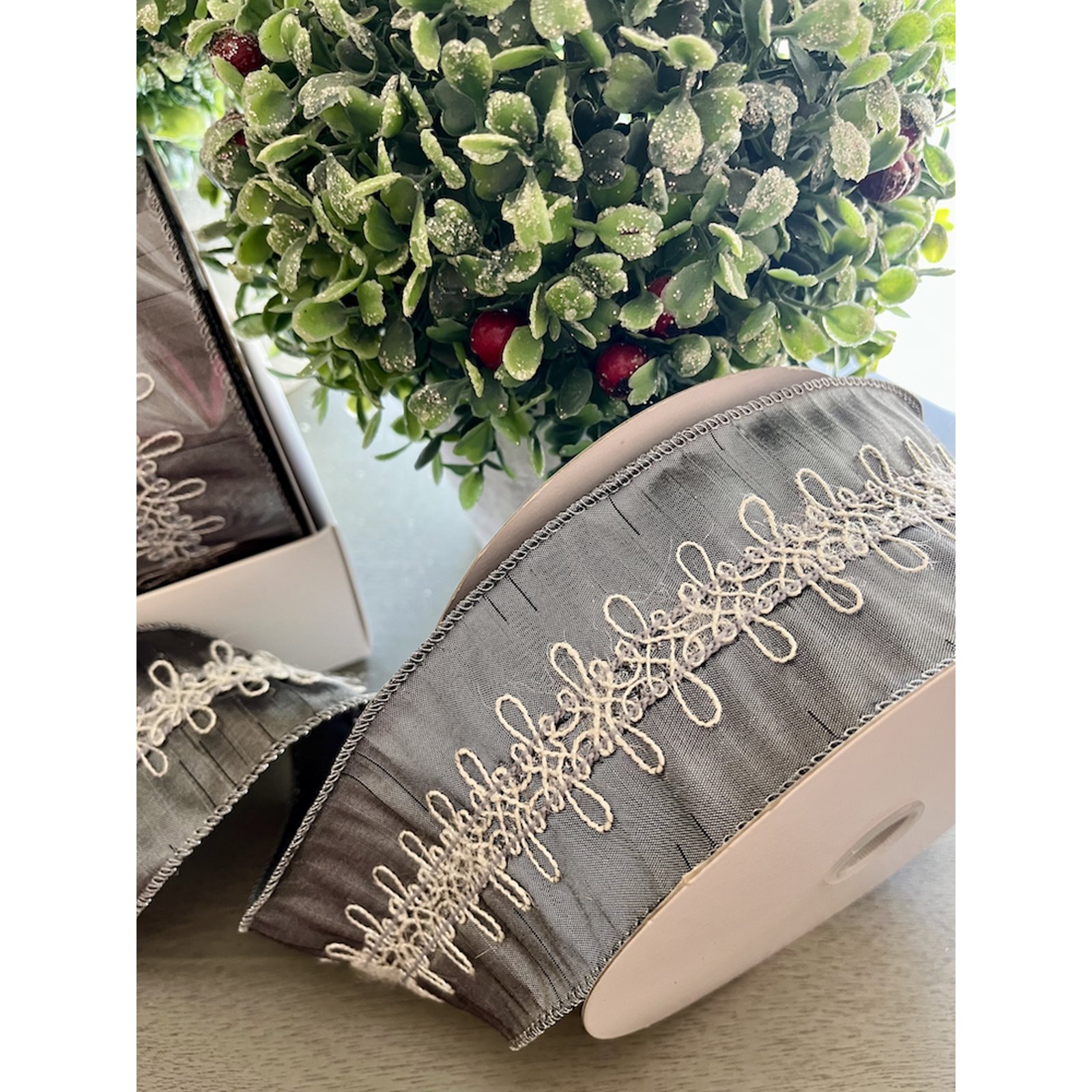 This luxurious soft silver grey ribbon has the feel of silk with a delicate white embroidered middle running all the way through the length of the ribbon. The white embroidery has a fine silver fleck which picks up the light and contrasts with the grey background. The ribbon has a small wire set into the woven edge so it can be shaped easily to create bows and ruffles to adorn the most gorgeous of gifts. This beautiful ribbon is so versatile it could also be used to fix into seasonal wreaths or woven into your Christmas tree.