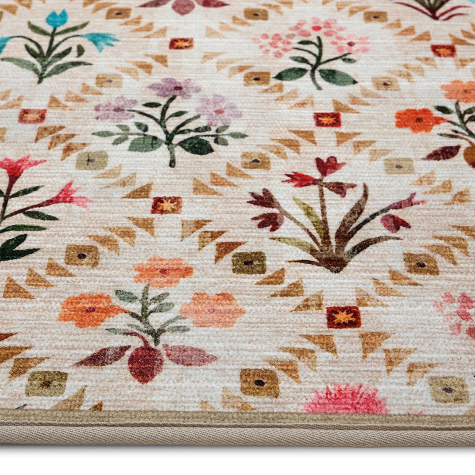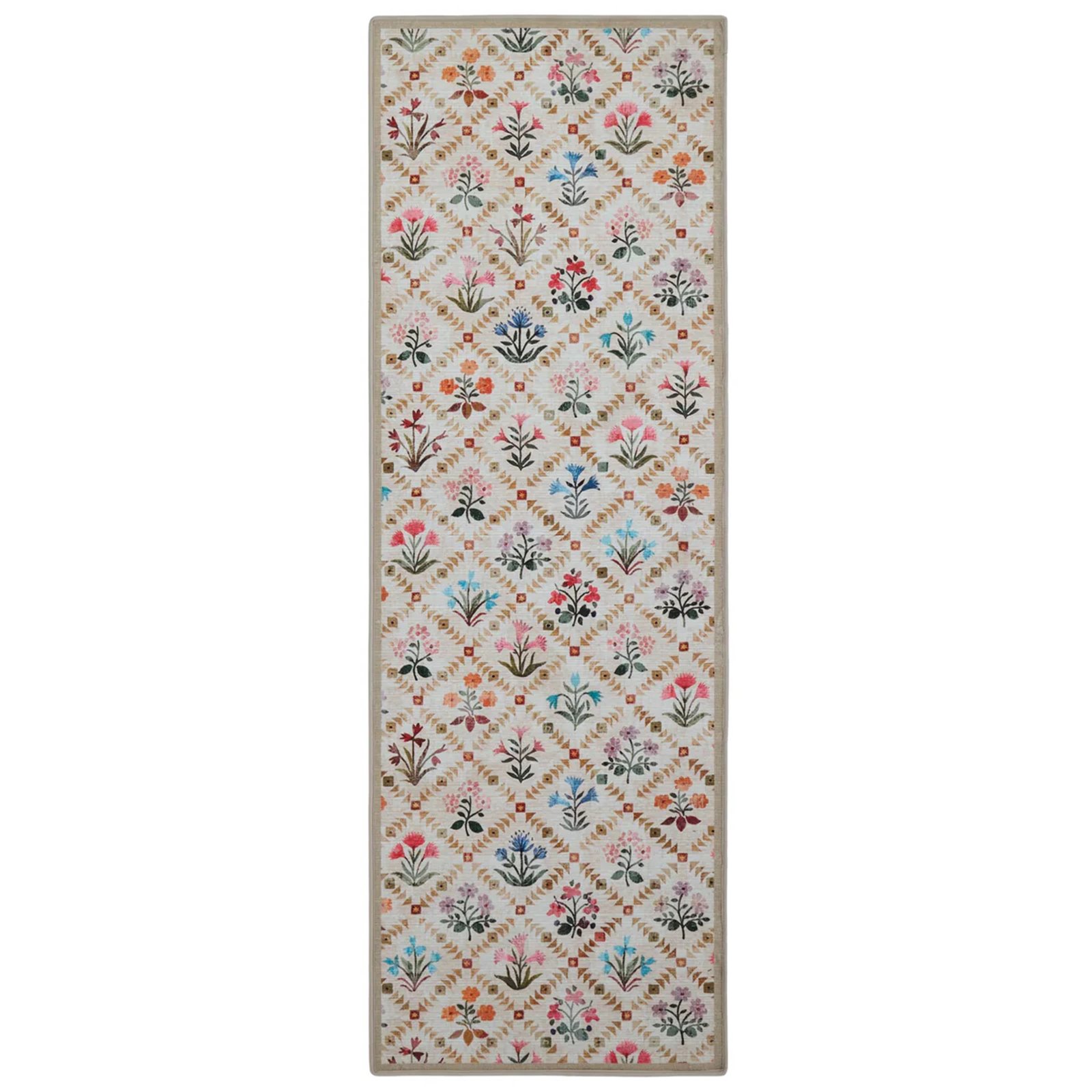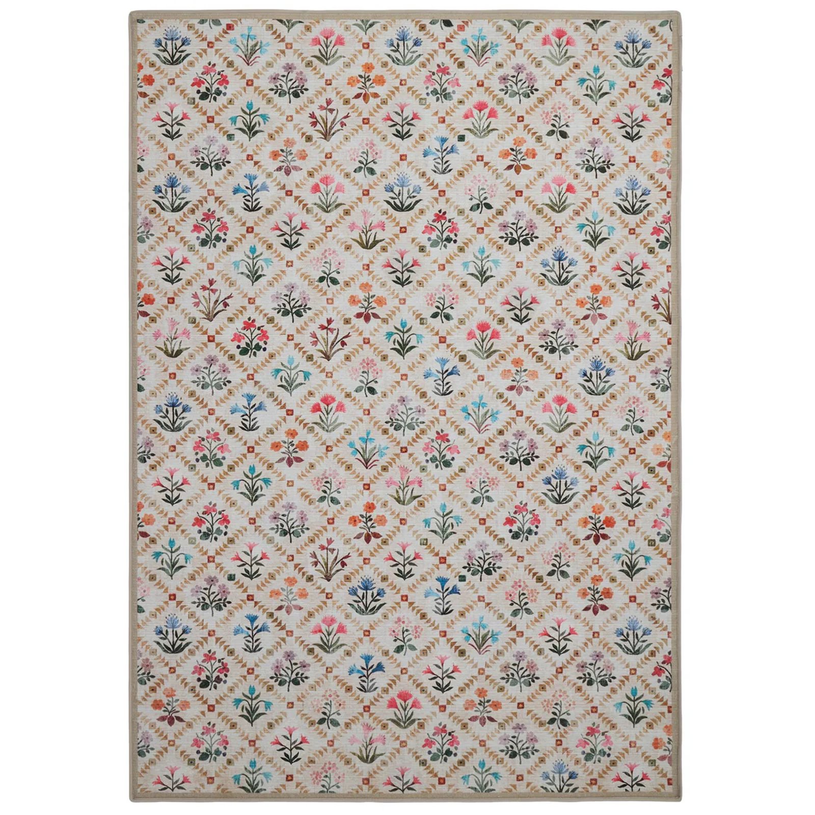 With a beige border, and a trellis pattern, our Wildflower Patch rug features posies of brightly coloured flowers in shades of pink, orange, purple, red and blue.