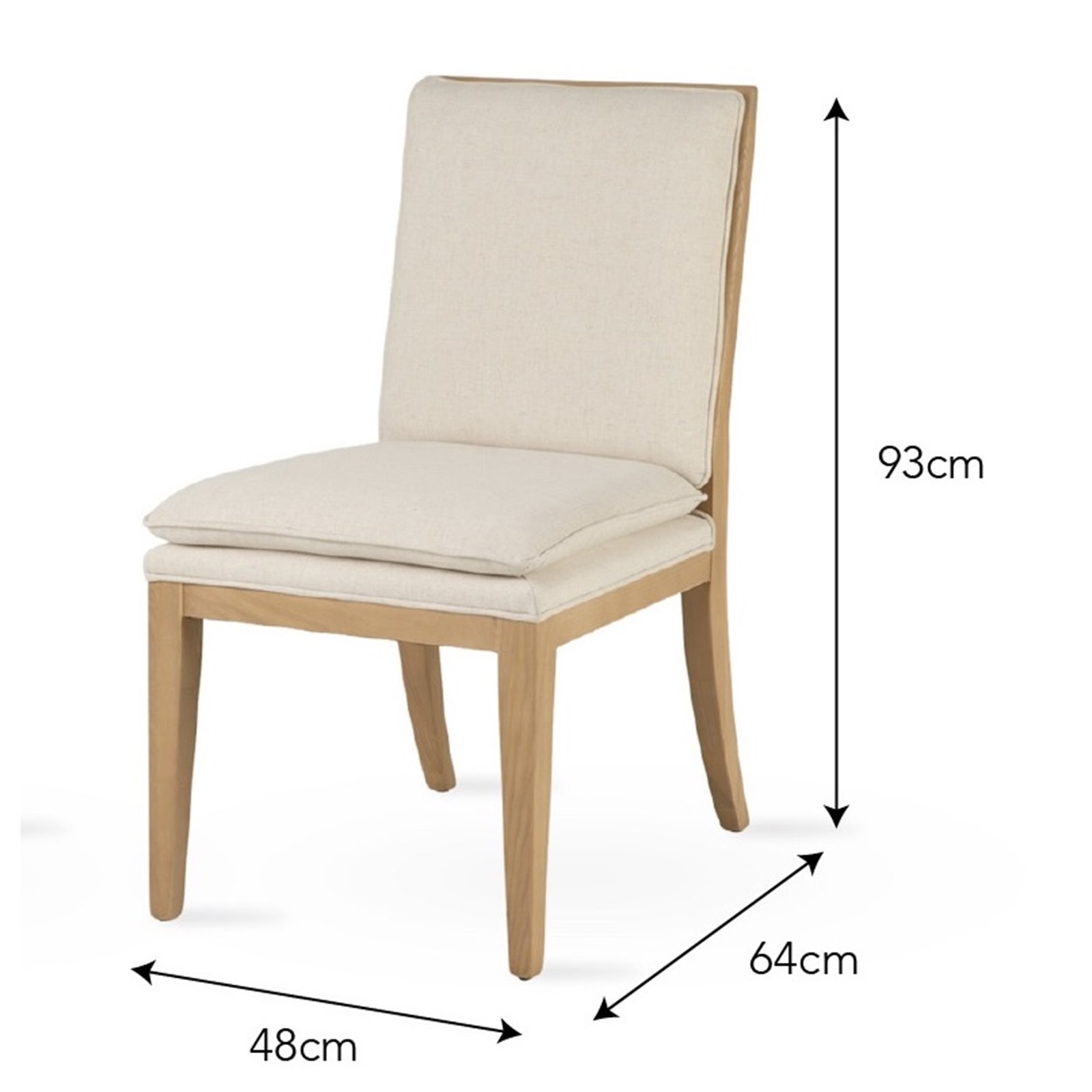 Our lovely new Verity Dining Chairs have non-removable back and seat cushions super thick and padded that make mealtimes comfier than ever. All beautifully finished with piping on each cushion and even on the back panel surround in the natural Linen mix fabric.  The solid frame is made from ash wood and with this natural-coloured upholstery it will compliment any colour palette, in a simple design that could be used in both classic and contemporary interiors.