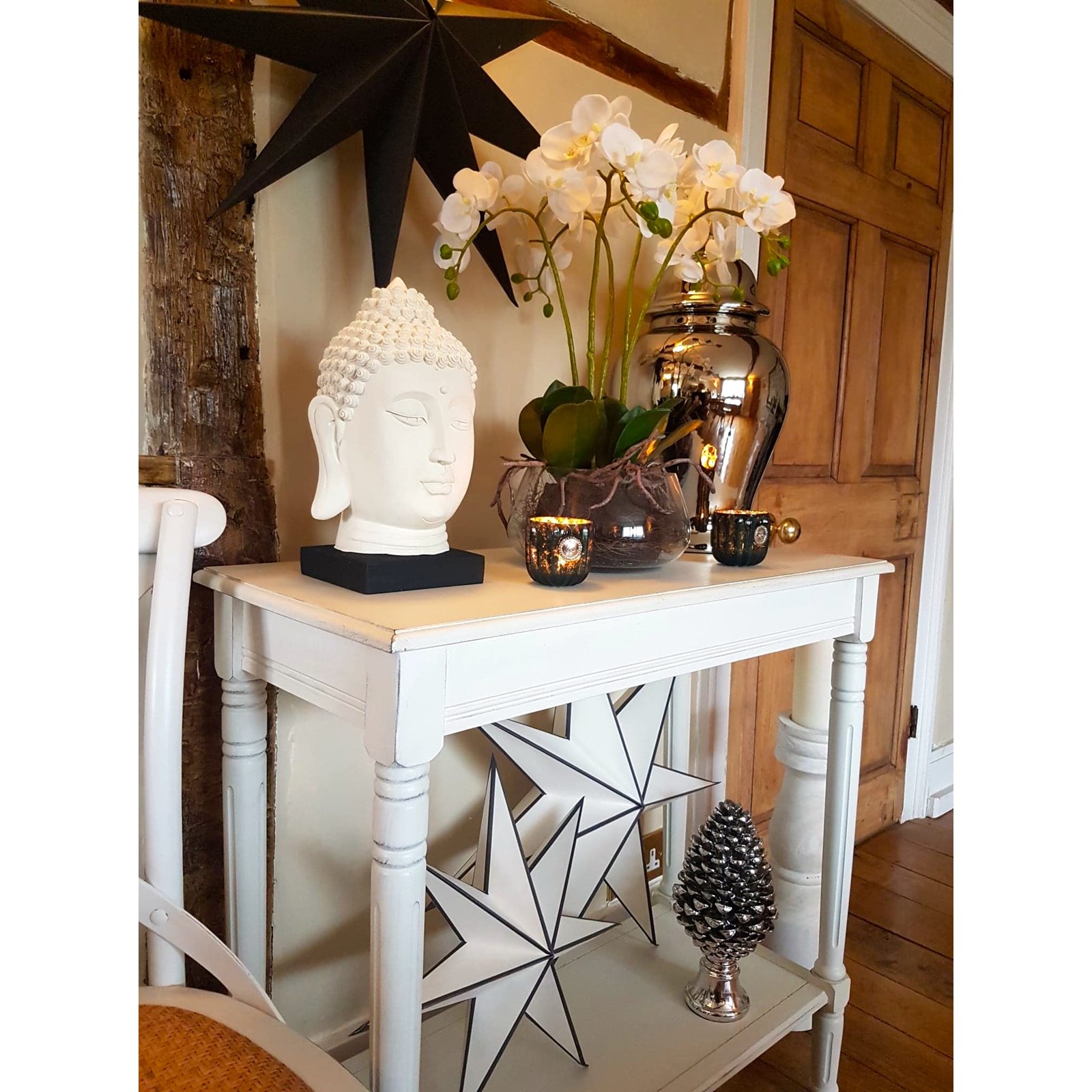 This versatile Console table is made in solid wood and finished with a detailed distressed vintage creamy white paint finish. The detailed woodwork has turned legs and a full bottom shelf with plank detail. Just a little self assembly require and you have a very versatile table.