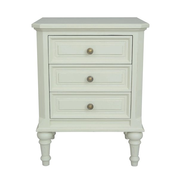 This elegant bedside cabinet has a beautiful washed white paint finish over the solid wood which still shows the warmth and grain of the natural wood. The cabinet has 3 handy drawers with lovely round drop brass effect handles in the centre of each drawer. A perfect bedside for a contemporary or classic room. Completely solid cabinet and hand finished making for totally individual pieces.