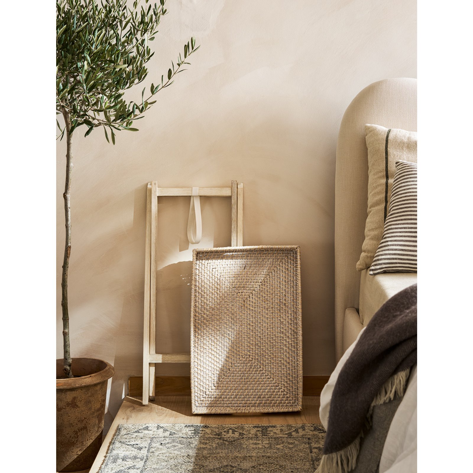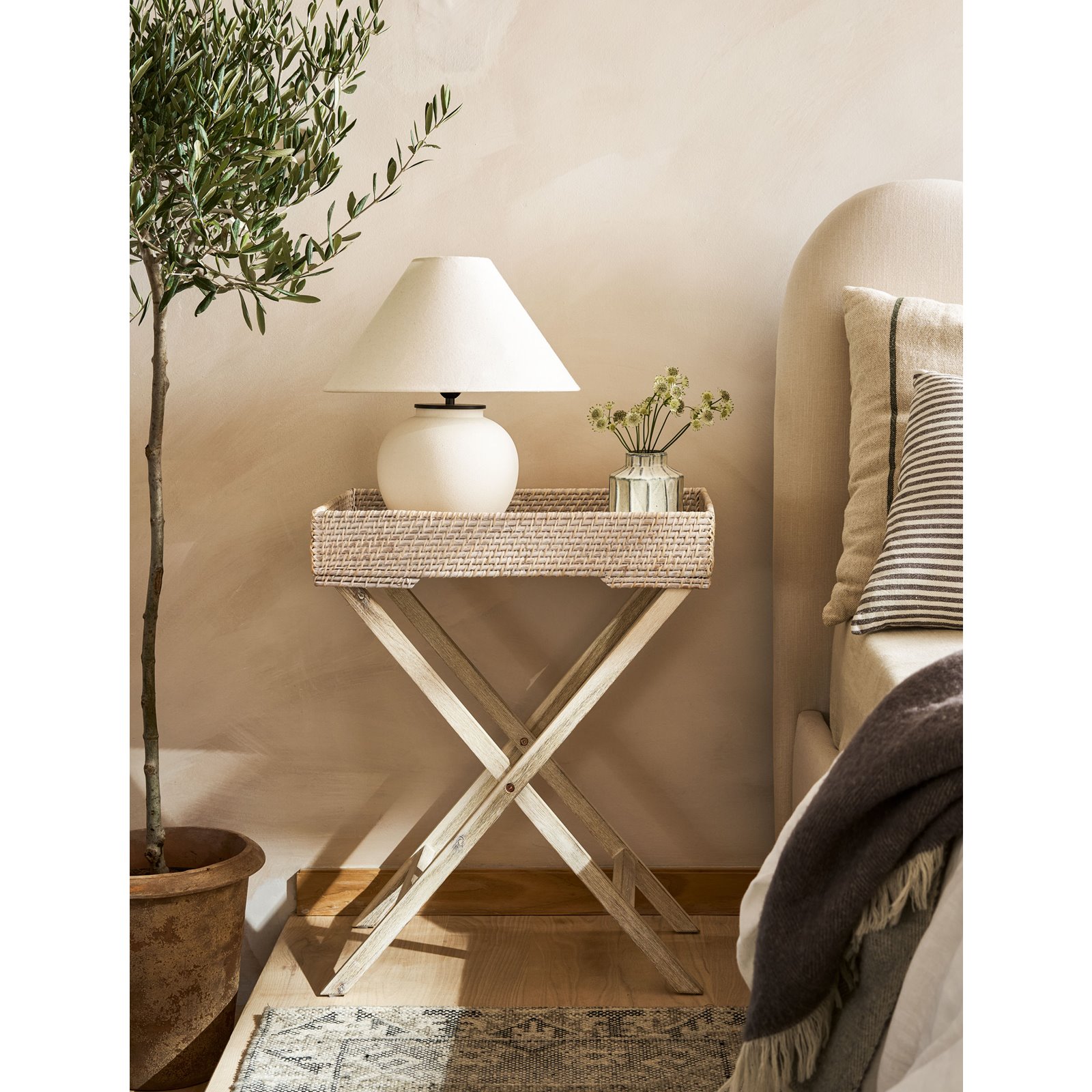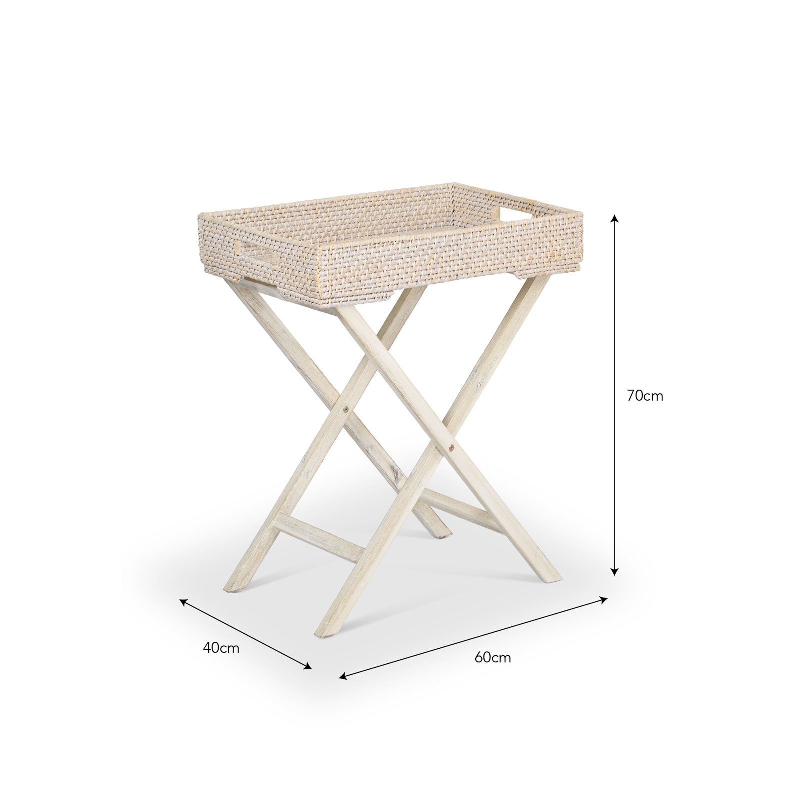 Handcrafted in Vietnam from rattan and acacia wood, this beautifully finished piece has a neutral white wash that will complement any existing colour scheme. It's easy to move and store away to create extra floorspace when it's needed, because unlike traditional side tables its tray table top is removable and the legs are foldable.