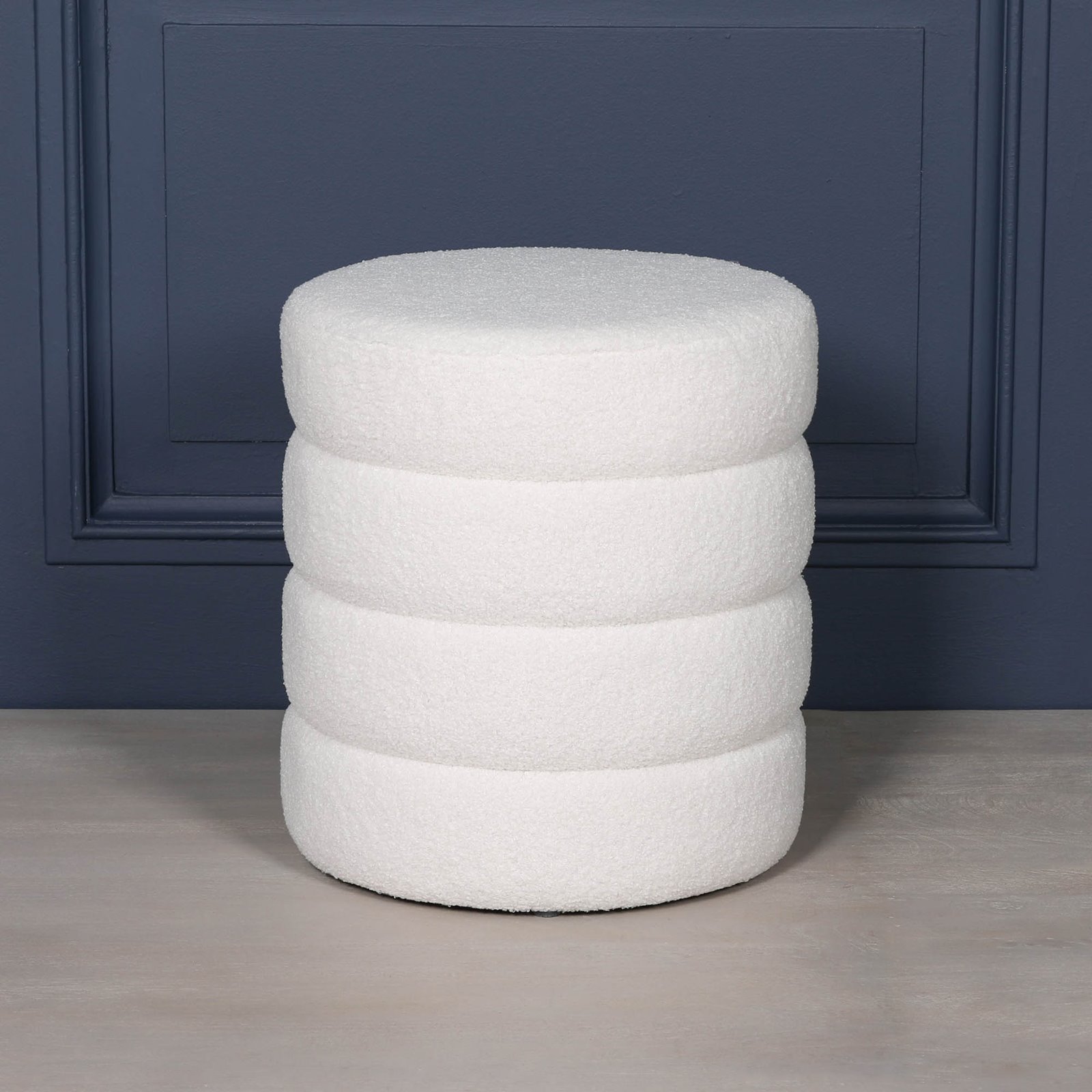 These boucle footstools are stylish yet understated. Available in a few styles this one is finished with a stitched side upholstery in rings around the body of the stool in white boucle.  The top of the footstool is flat with a stitched flat top. Set on a hardwood frame and slightly padded all over.