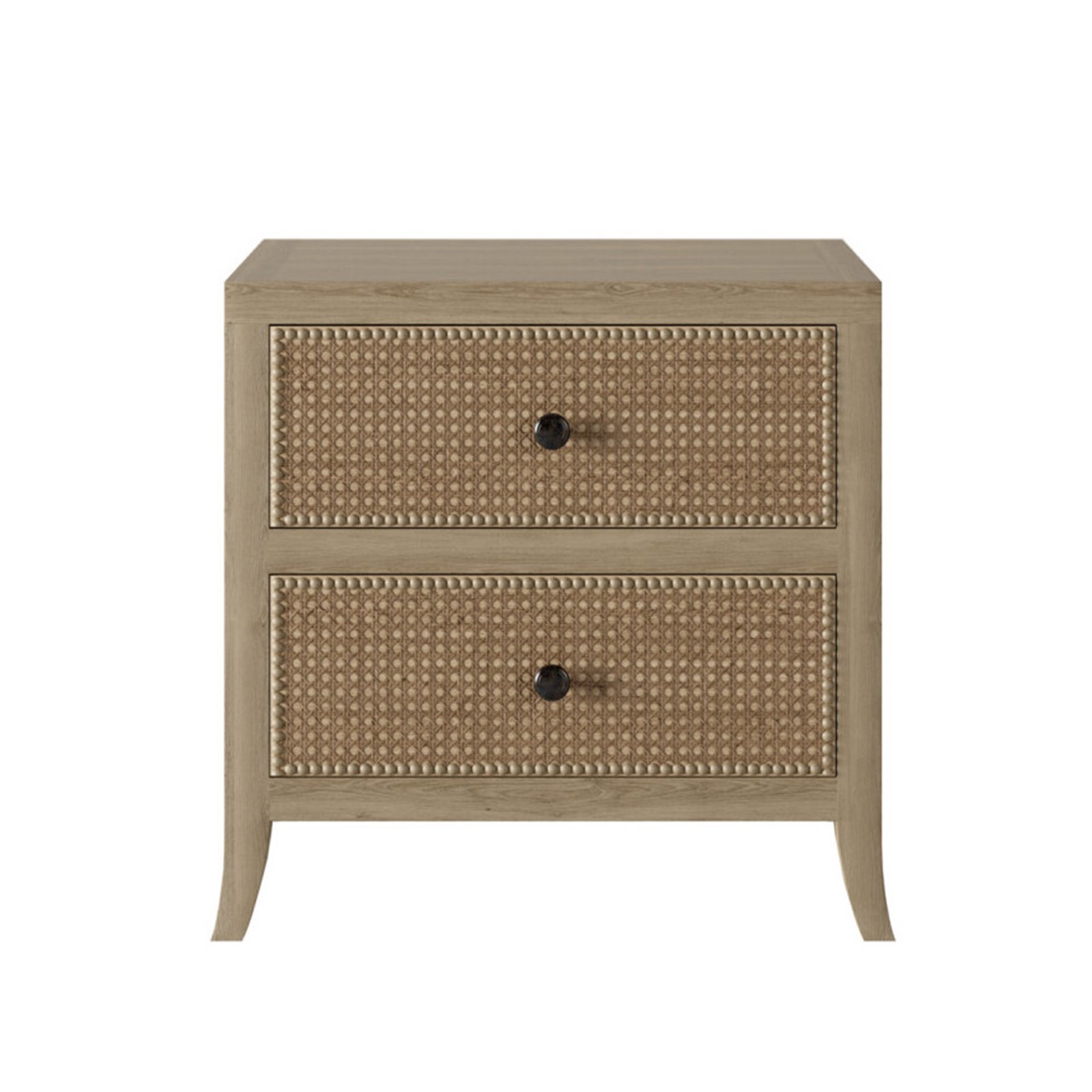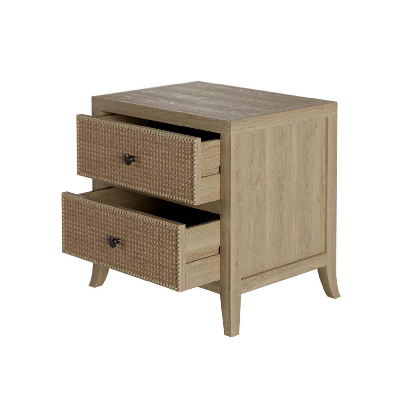 This lovely bedside table has been given a wash over the solid Oak giving a soft grey finish. Crafted for trade professionals and interior designers, the Wickham two-drawer bedside table is built with both aesthetics and durability in mind. Solid wood with veneer internals there are detailed rattan latticed drawer fronts with a raised beaded surround. The drawers are on wooden runners and painted grey on inside. There are small  tapered legs and contrasting small round gun metal style handles